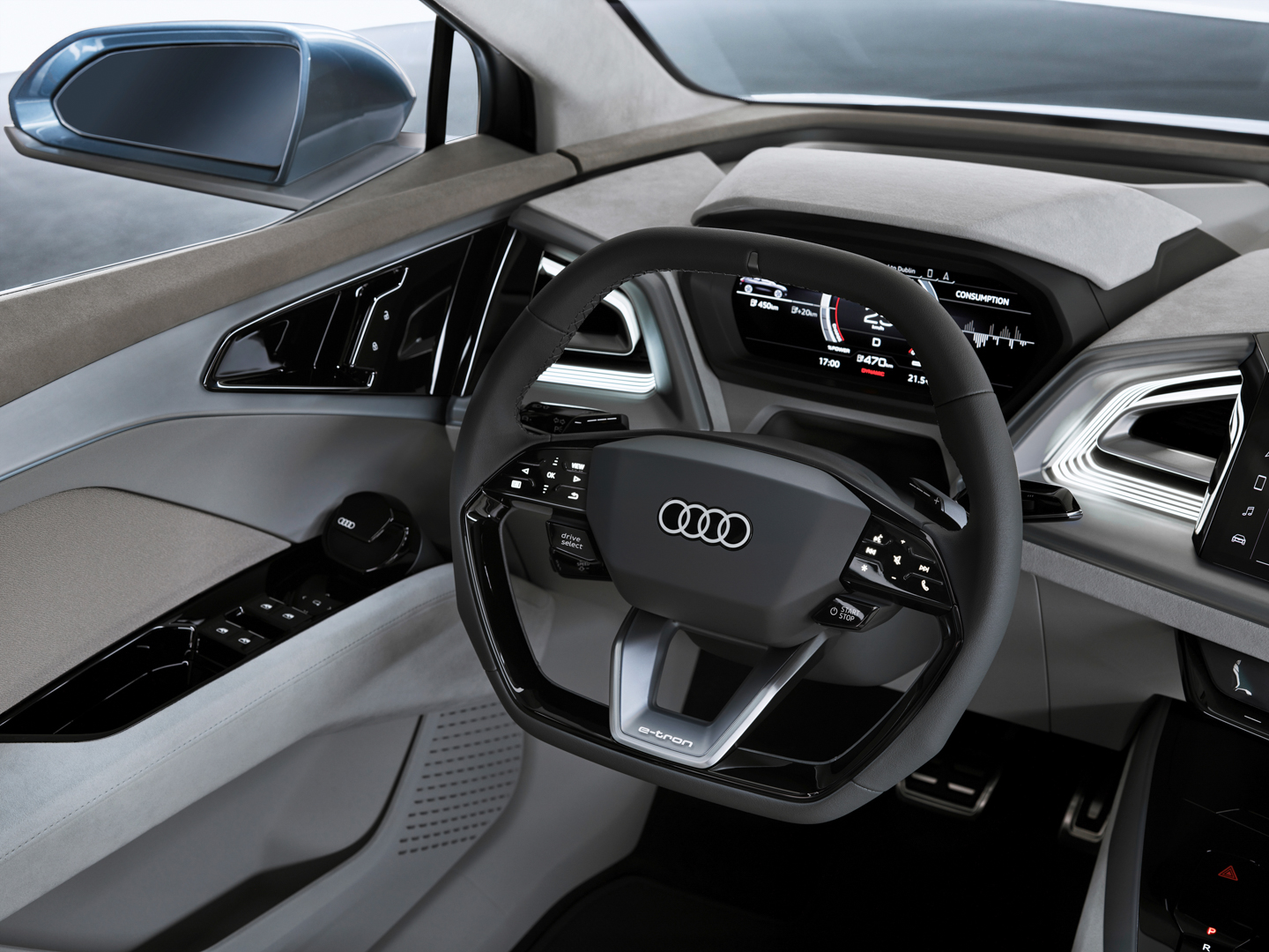 On the inside, the Audi Q4 e-tron looks like a mashup between the Audi Q3 and e-tron SUV. So it has the same basic layout of the Q3, just with some of the e-tron’s fancy tech and Virtual Cockpit. It’s not the most lavish of interiors but it’s smart looking, high-tech and simple. Build quality will likely be superb, as with all Audis.