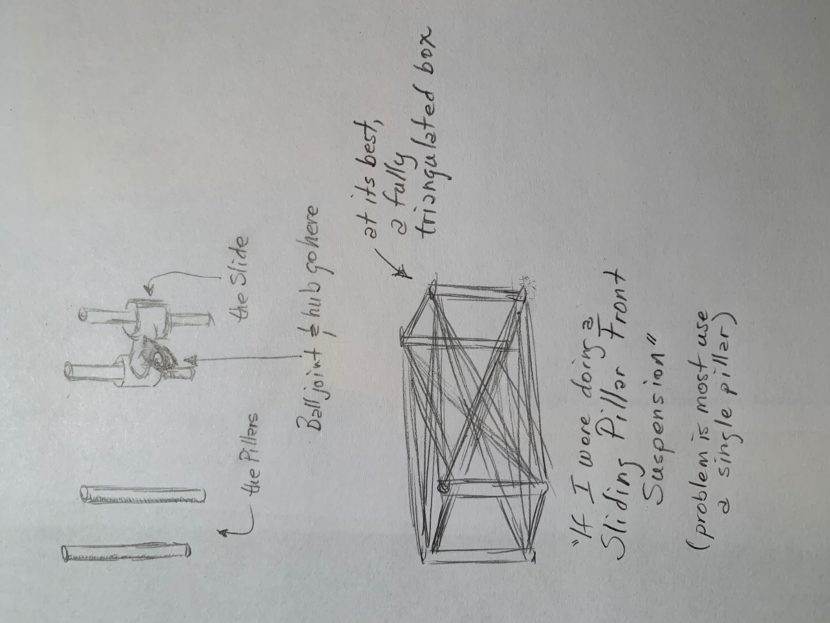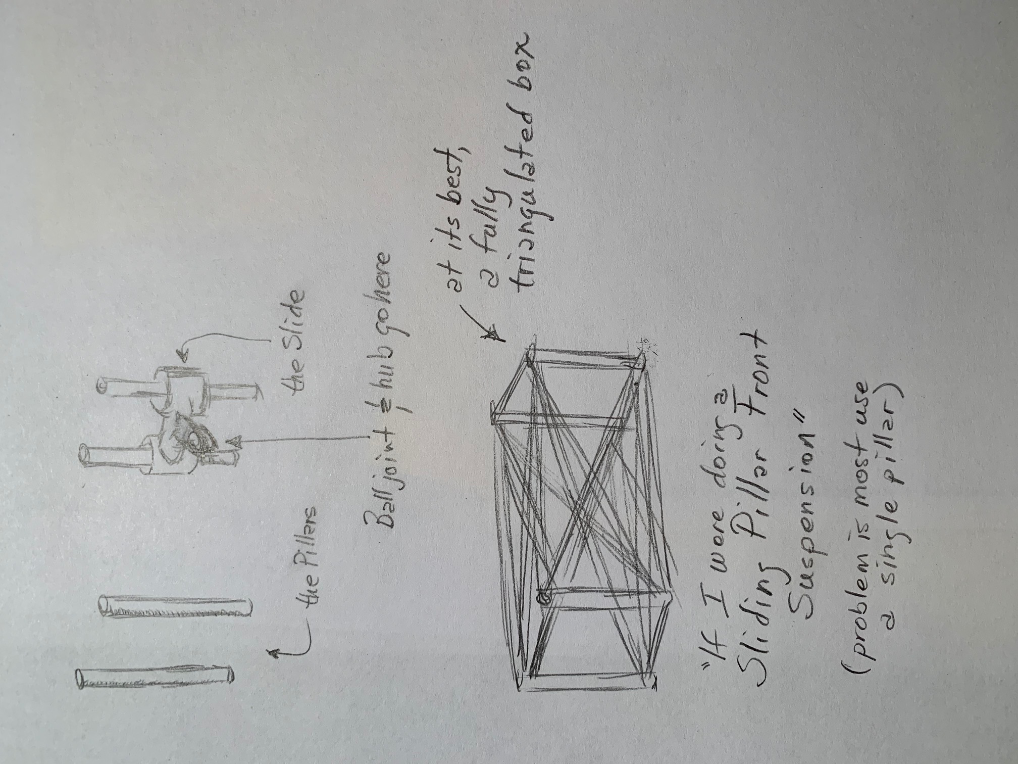 If I were to build a sliding pillar front suspension I would use twin pillars, a hub assembly with a tongue long enough to accommodate wide tires and springs with shocks mounted to bell cranks. The pillars would be tied together side-to-side with a fully triangulated 3D structure, like the attached amateur illustration. But the hub, with it’s long tongue would have to made of super light and stiff Unobtanium (think of the titanium wing pivot boxes from the old F-14 Tomcat), the space for the triangulated cage may be able to house the dampers but otherwise it just takes up precious real estate. And woe be unto me if I intend to achieve pedestrian impact standards.