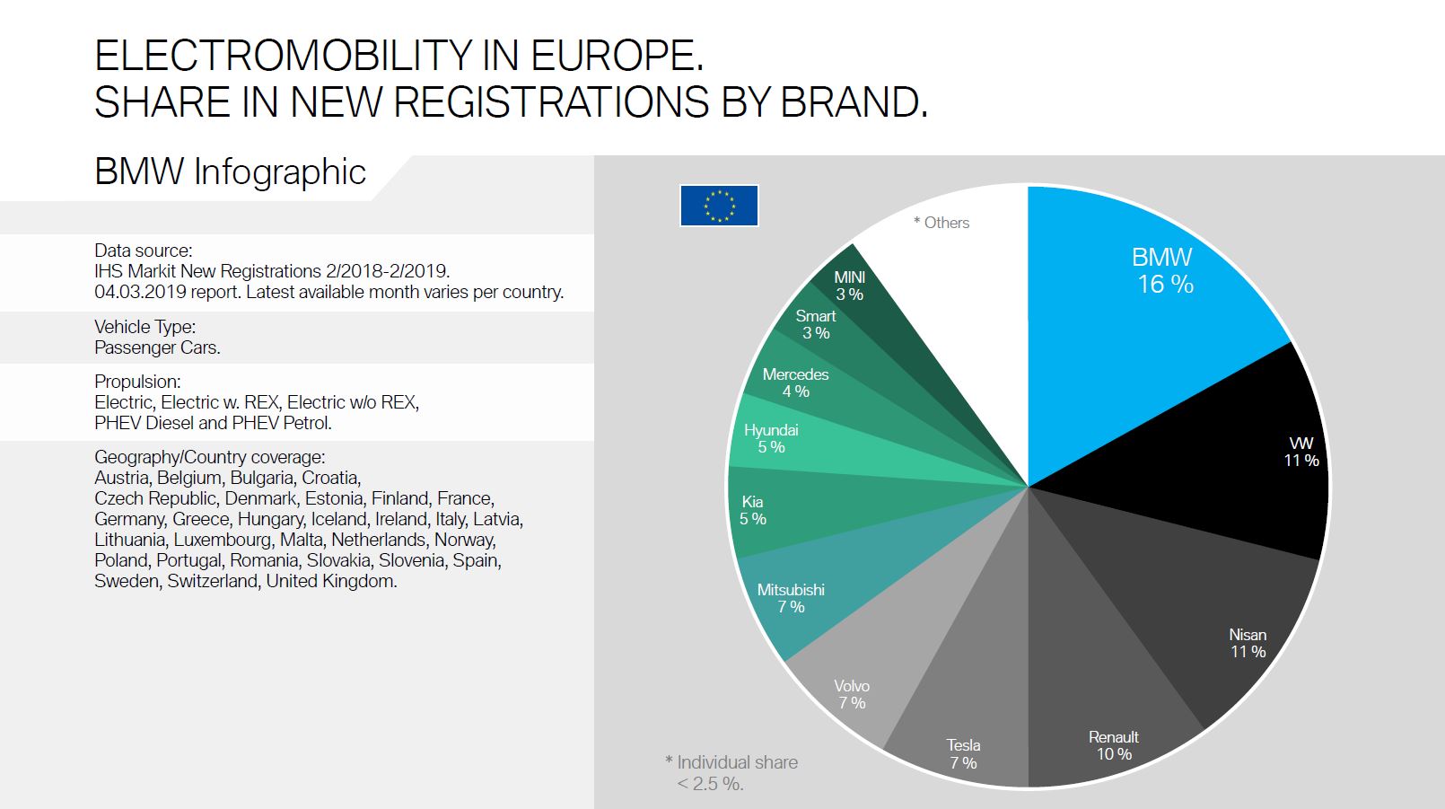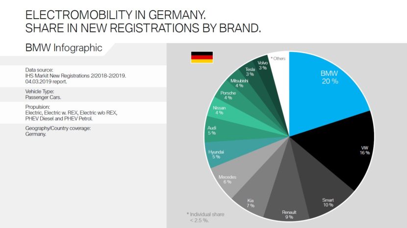 Over the course of February, BMW sold 16 percent of the total electrified cars sold in Europe. Second place went to Volkswagen and Nissan with 11 percent. Renault came in third with 10 percent overall, while Tesla accounted for just 7 percent. Things looked even better for BMW in Germany, with a 20% cut of the market, followed by Volkswagen in second place with 16 percent and smart on the podium as well with 10 percent. Renault, Kia and Mercedes follow with 9, 7 and 6 percent respectively.