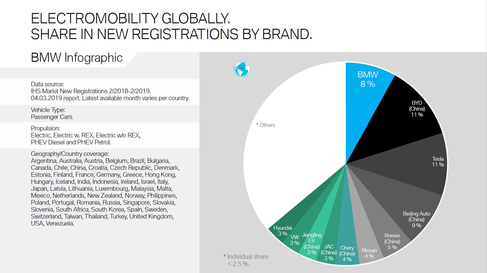 Moving to a global scale pushes BMW to third place. BMW’s sales accounted for 8 percent of all electrified cars sold worldwide last month, a more than decent figure. Tesla and BYD (Build Your Dreams, China) share the top spot with 11 percent, while Beijing Auto, another Chinese company, comes in second with 9 percent. As an interesting note, even though you might’ve not heard about BYD before, BYD Tang and BYD Qin are the best selling PHEV models worldwide in 2018, the podium being completed by BMW’s 530e model.