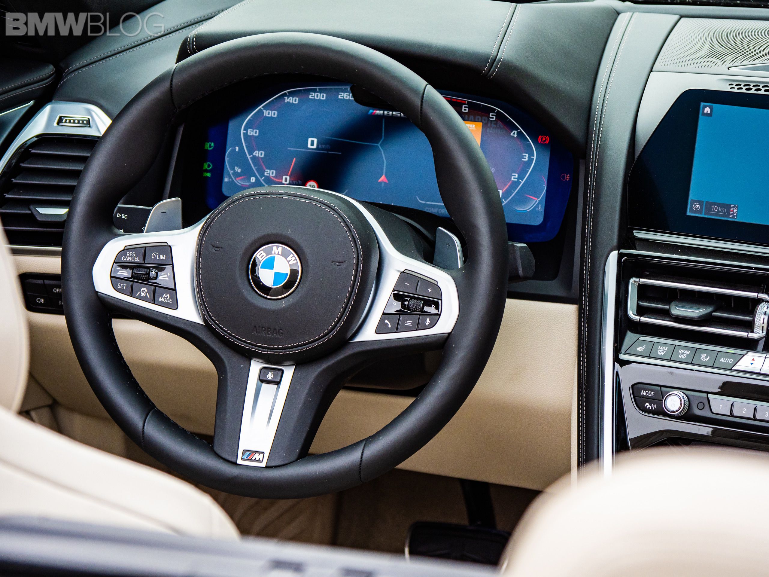 Climbing behind the wheel is quite a treat; the convertible welcomes you with a premium cabin which inherits almost of all its elements from the coupe. The Merino leather of the front seats in Ivory White is superb and of the highest quality, and when paired with the fine-wood trim ‘Fineline’ copper effect high-gloss, the experience becomes even more premium for the driver. The tech also comes from the coupe-brother, so you’re getting the same dual 12.3 inch screens, paired with the Glass Application in the M850i, and an M Sports steering wheel.