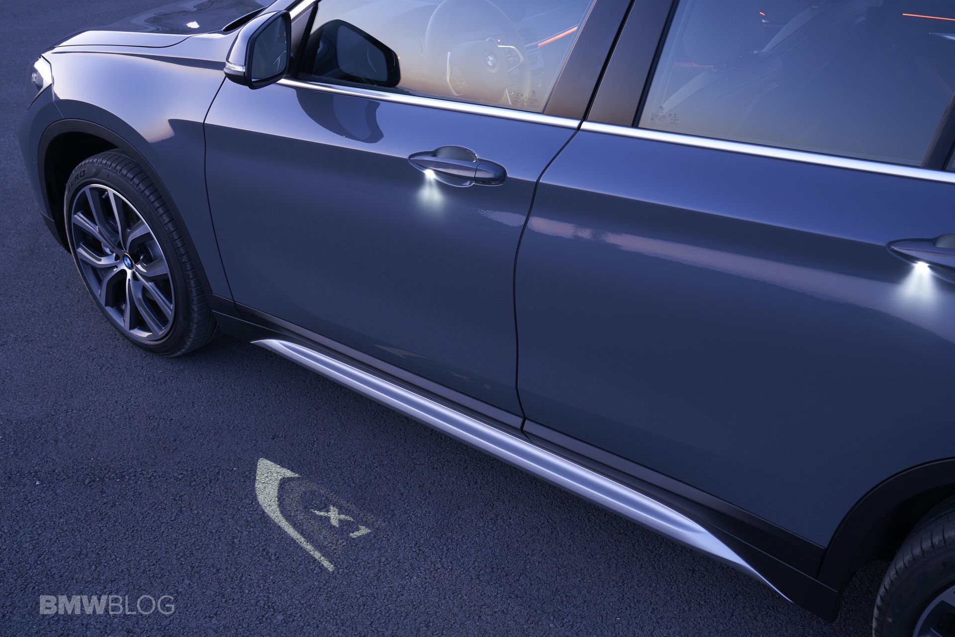 Another highlight can be found at the driver’s- side exterior mirror, which projects a two-tone LED “X1” image when the car is unlocked. This function is part of the optional lighting package.