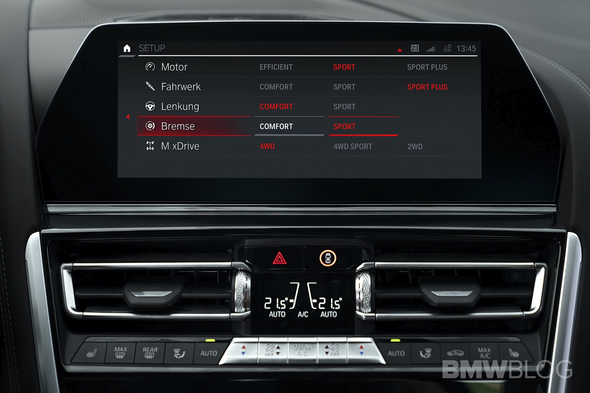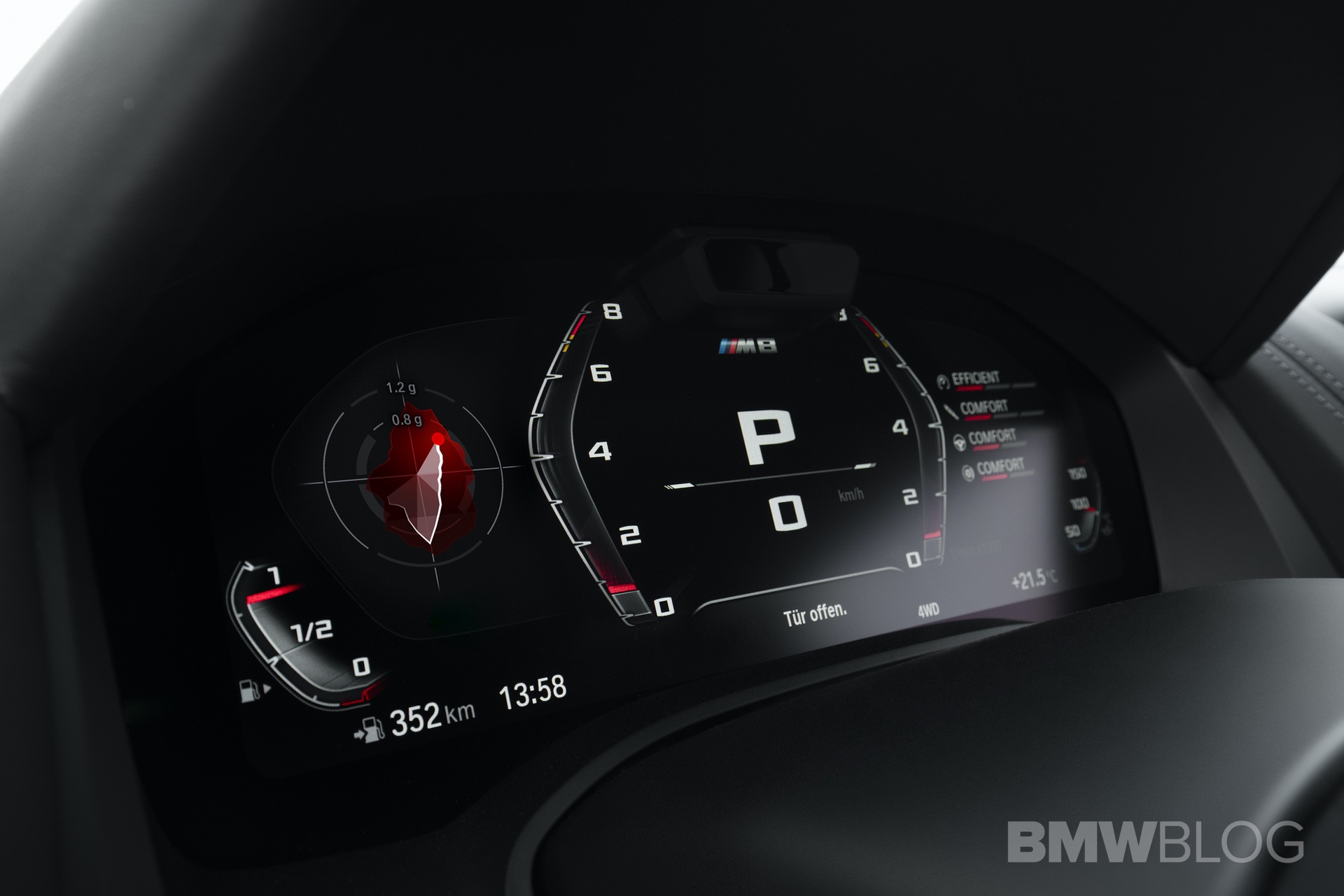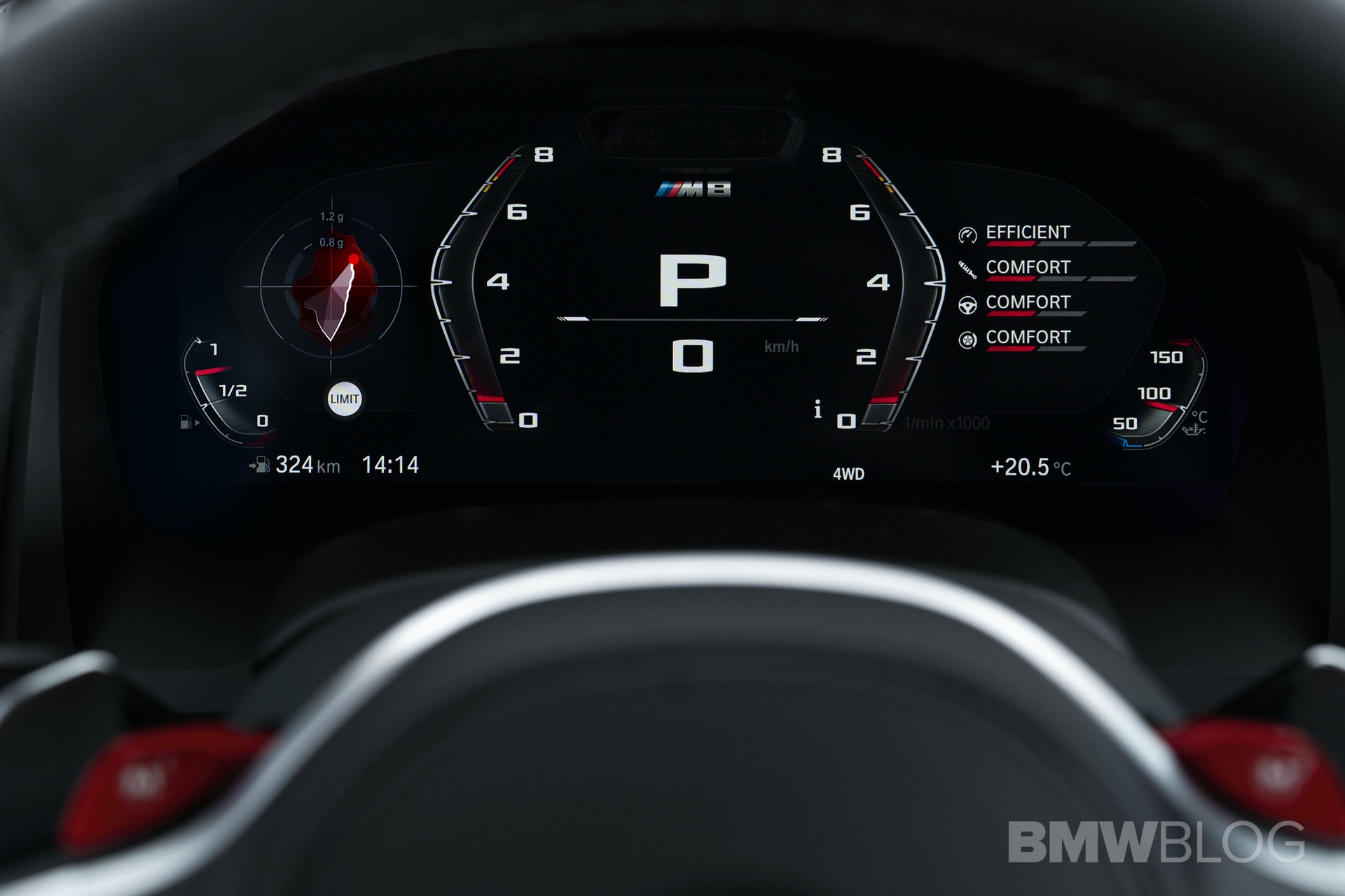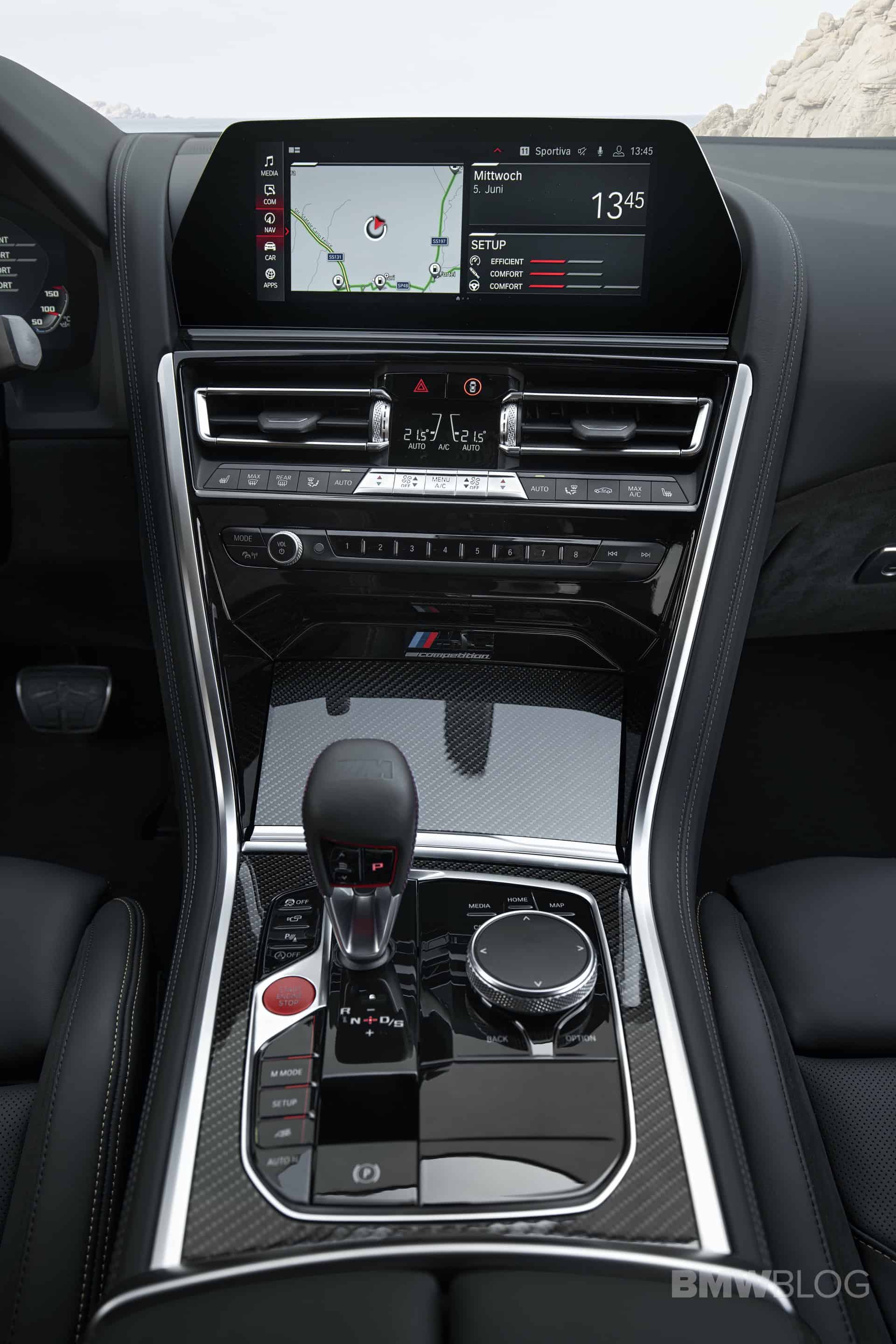 Red accents on all of the buttons make the center console seem a bit sportier than the standard 8 Series’. Though, the actual design is virtually unchanged. The steering wheel gets the same red ‘M1’ and ‘M2’ buttons as in the M5 and the digital instrument panel gets the new M style screen option.