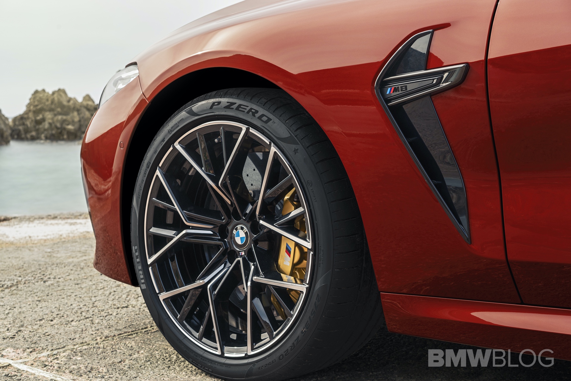 To slow all of that down, the BMW M8 Convertible gets quite large brakes. Up front, 395 millimeter rotors are squeezed by six-piston fixed calipers, while the rear axle uses 380 millimeter rotors and single-piston floating calipers. If you opt for the M Carbon Ceramic brake package, the rotors are replaced with 400 millimeter carbon discs up from and 380 millimeter carbon discs out back.