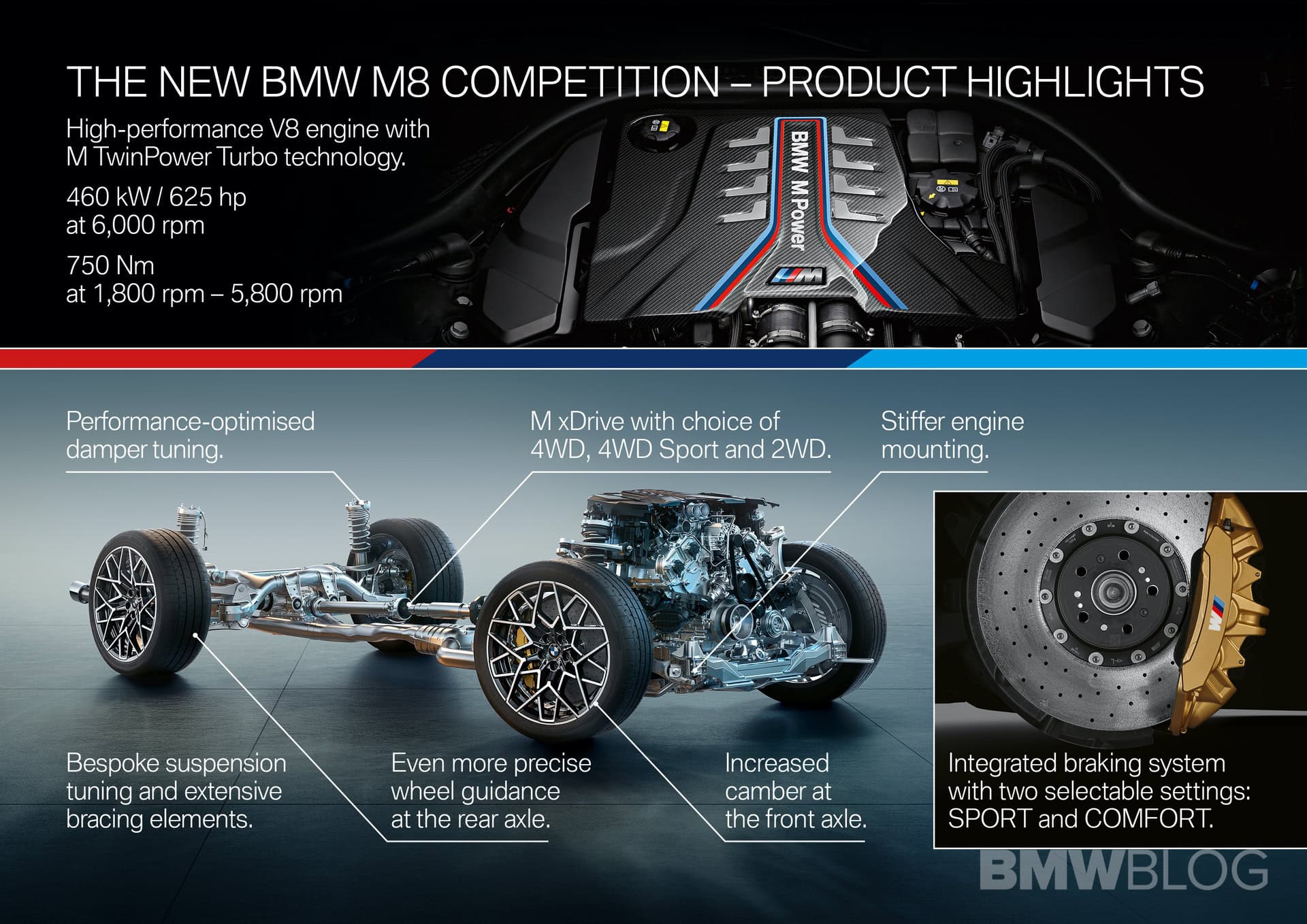 A new technology for the BMW M8 is the brand’s new integrated braking system. It’s a brake-by-wire setup that uses a vacuum-free brake booster and an electronic actuator to control braking forces. This makes the system not only more accurate but also lighter. It also reduces and sort of change in pedal feel due to wet conditions, allowing for a more consistent pedal feel. There are also two modes for the brake pedal, Comfort and Sport, which allow the driver to choose what sort of brake pedal feel they’d like and when they’d want it.
