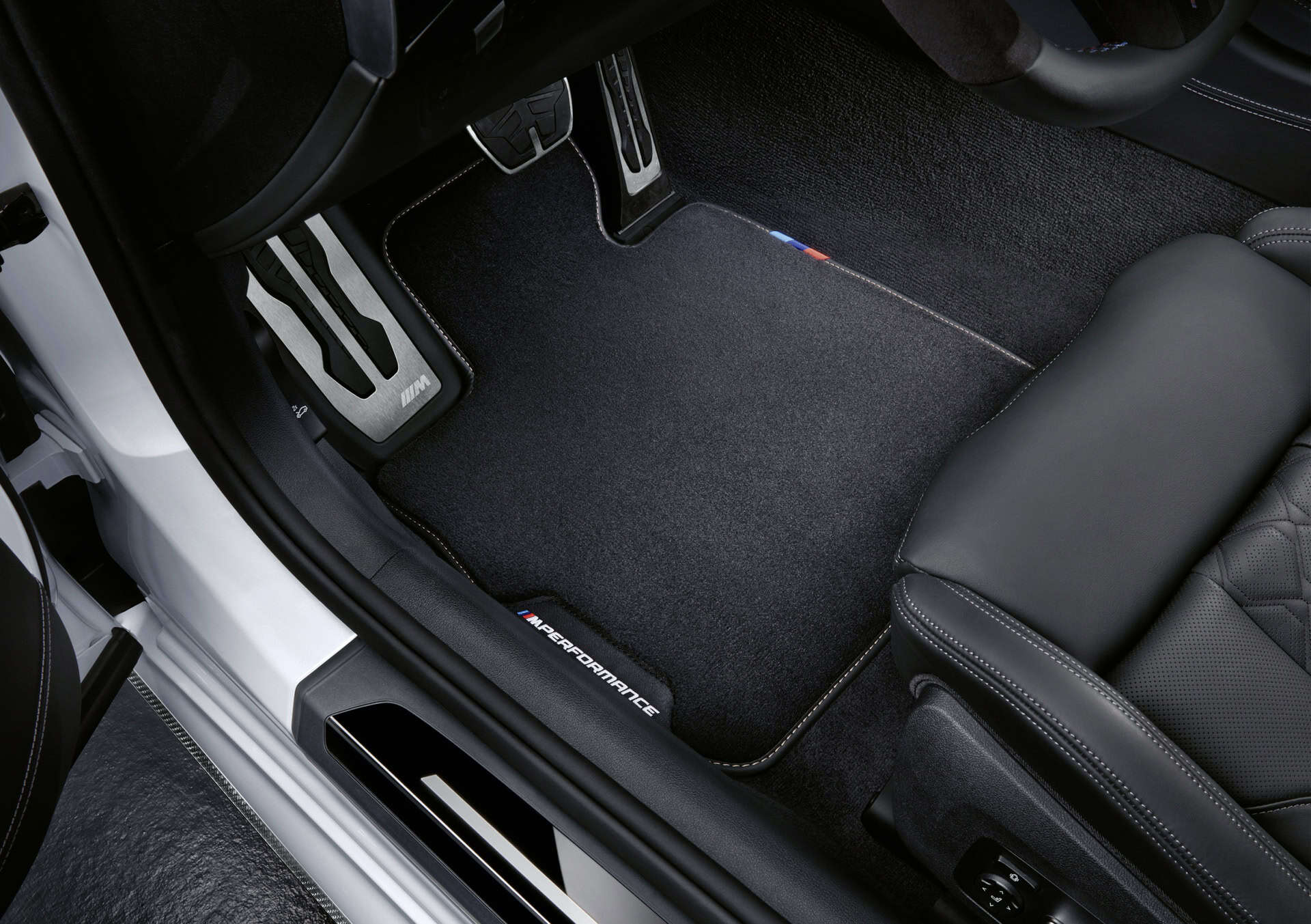 The refined motor racing ambience can be perfectly rounded off with non-slip, easy-grip M Performance floor mats made of velvet velour with leather-style surround, M Performance inscription and a pennant in the typical M colors.