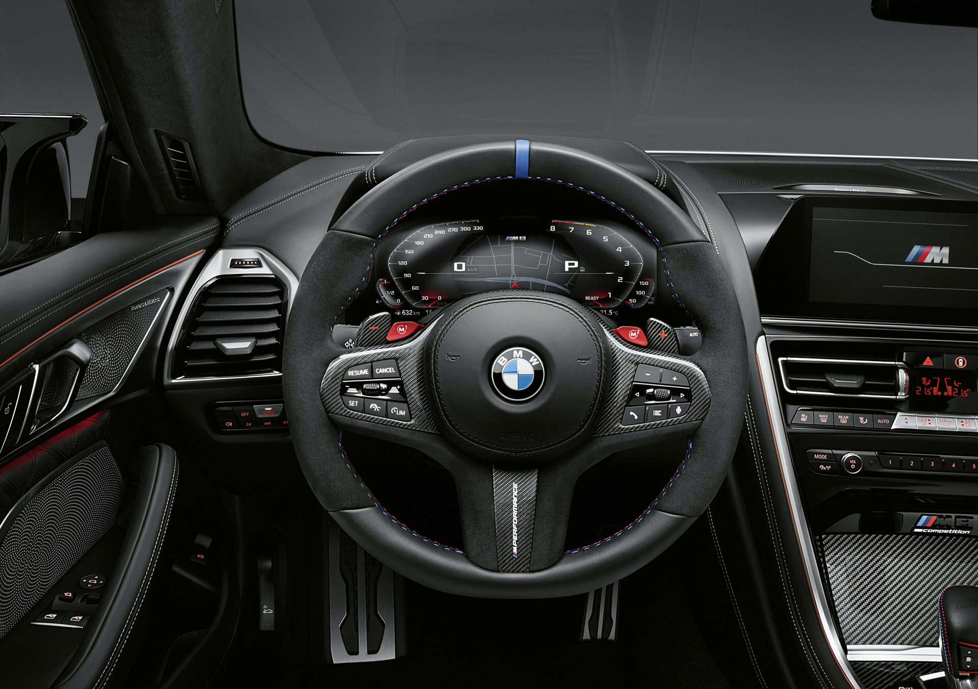 Inside the cabin, a key factor of the aftermarket program is the M Performance Pro steering wheel with carbon fiber shift paddles and carbon fiber/Alcantara – carbon fiber/leather trim. Thanks to its impressively shaped Alcantara grip areas with large thumb rests and special underlay, it guarantees excellent grip therefore a direct steering feel. With their shift symbols in bold red, the carbon fibre shift paddles – also separately available for the standard steering wheel – emphasize the racing theme, as do the blue central marking on the M Performance Pro steering wheel.