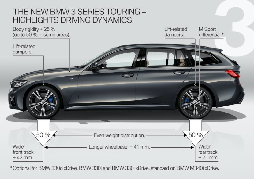 To help increase efficiency, performance and handling across the board, the G21 BMW 3 Series Touring is also lighter than before. While the new G21 is only about 10 kg lighter than the outgoing F31, model-for-model, it’s also longer, wider and better equipped as-standard. So it’s lighter while offering more car. A lot of that has to do with new lightweight materials. For instance, the front struts and subframes are made from aluminum, as are the hood and front fenders. It also gets 50/50 weight distribution and a 25-percent increase in structural rigidity, versus the outgoing car.