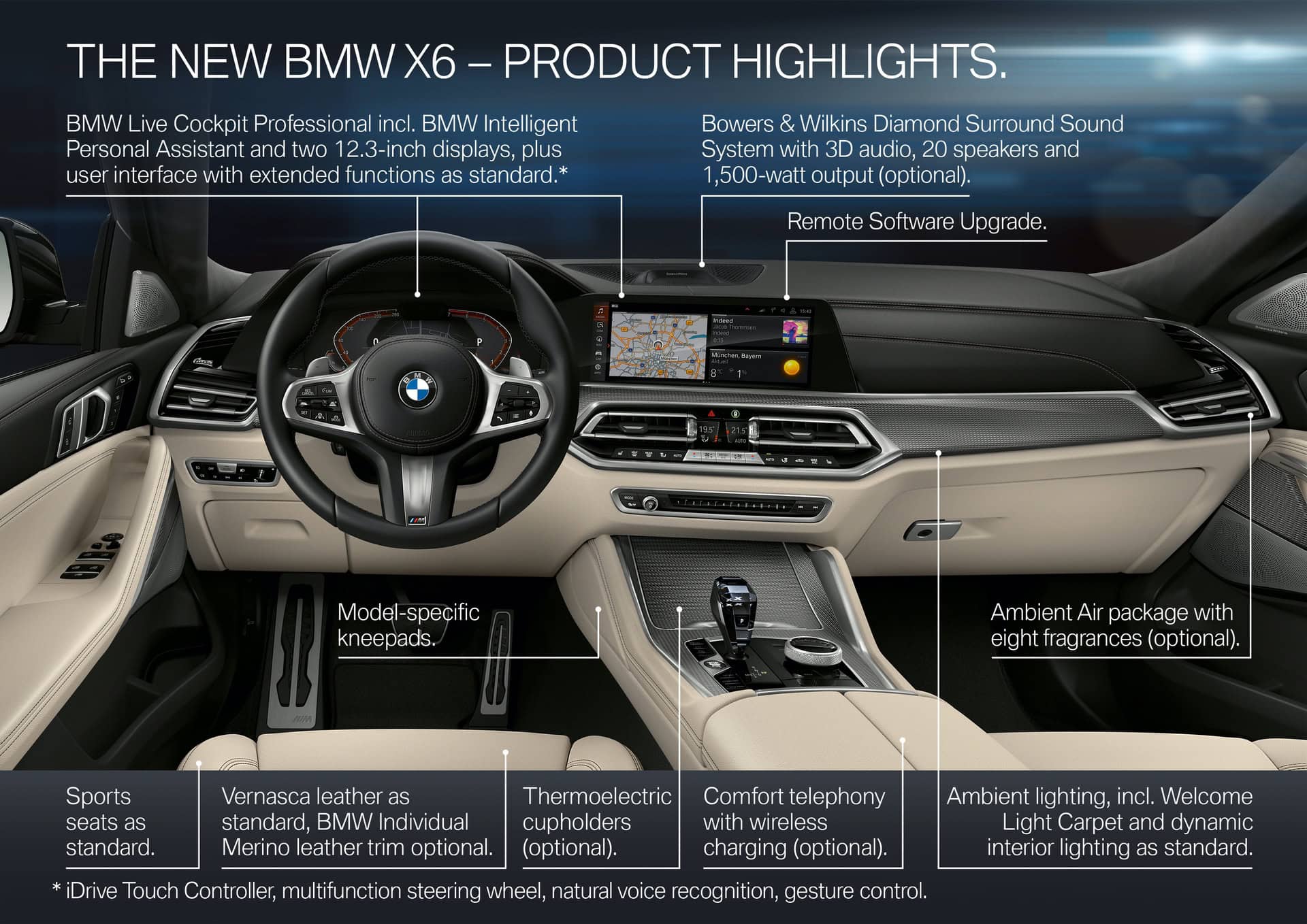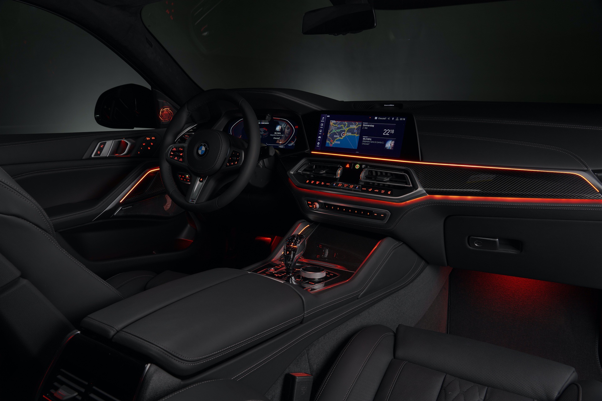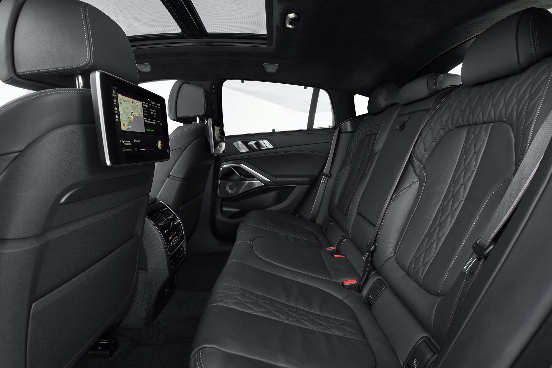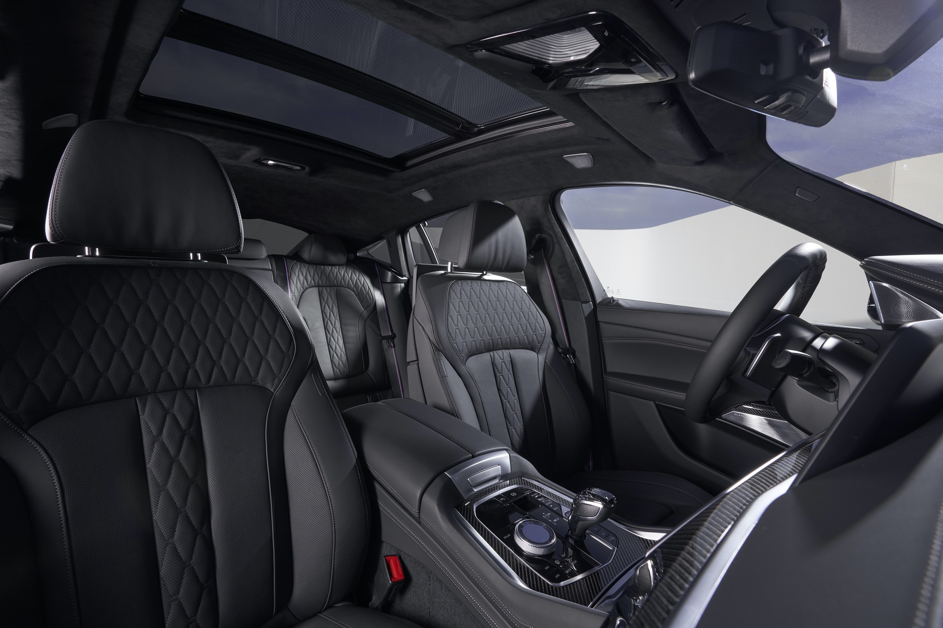 Just like the BMW X5, the X6 gets thermoelectric cupholders (that’s a fancy way for saying they’re heated and cooled), which are honestly brilliant. It also gets a Panoramic Glass Roof Sky Lounge, which features 15,000 illuminated patterns in the glass at night. There’s also the same glass effect options, on the shift lever, starter button and even the volume knob, as the X5, X7 and 8 Series.