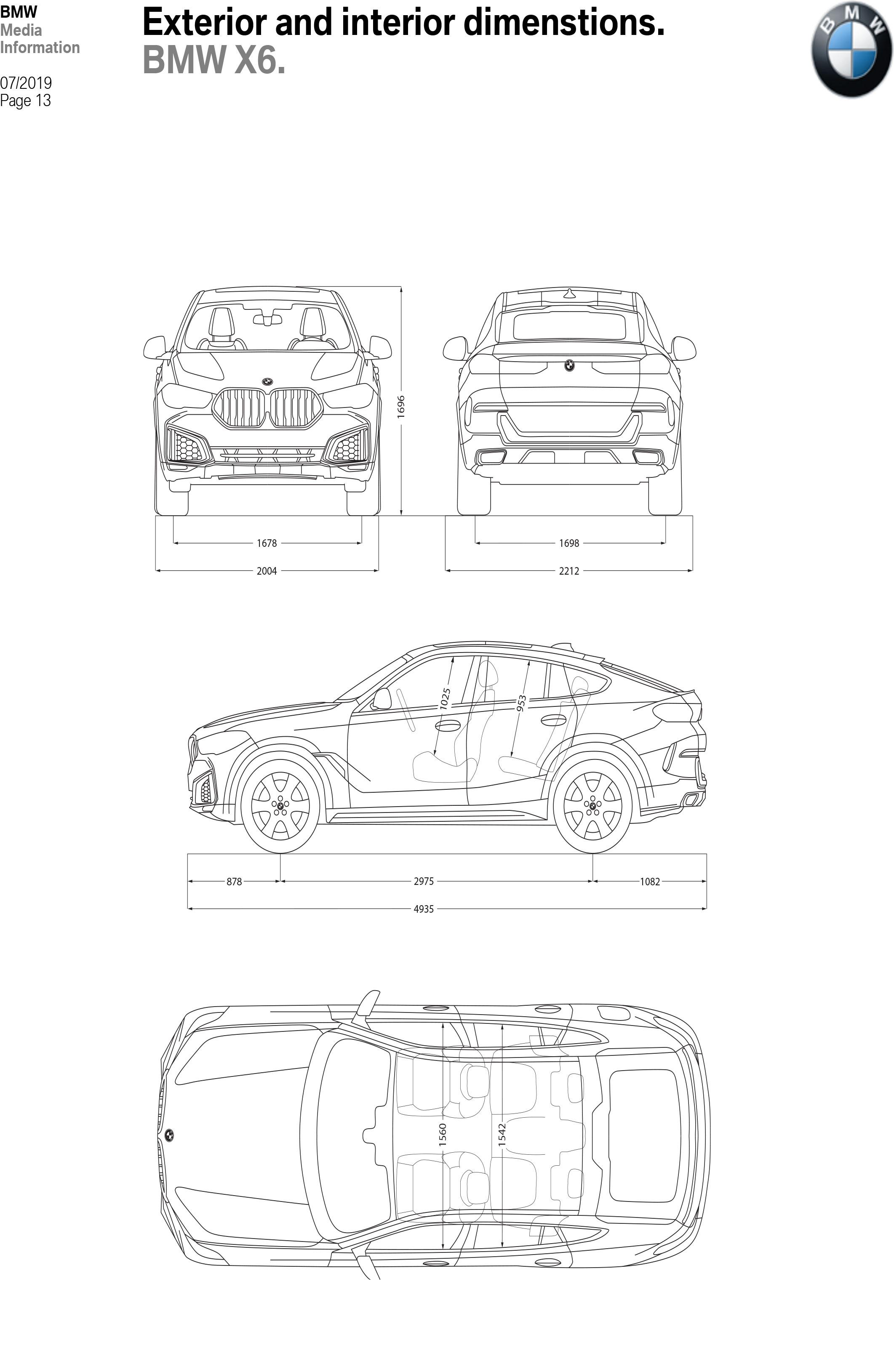 The new BMW X6 has grown by 26 millimetres in exterior length over the outgoing model (to 4,935 mm) and by 15 mm (to 2,004 mm) in width. It now stands 6 mm lower (at 1,696 mm) and combines dynamically stretched proportions with an extremely powerful appearance, which is enhanced by a wider front track (+44 mm to 1,684 mm). The car’s wheelbase has increased by 42 mm to 2,975 millimeters, and the new model also has a lower center of gravity than its predecessor.