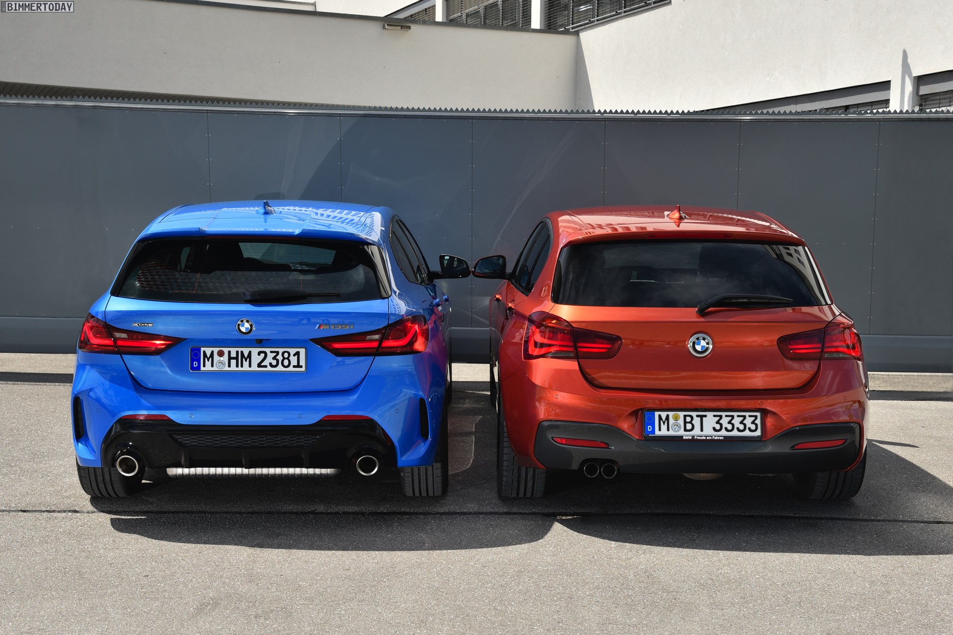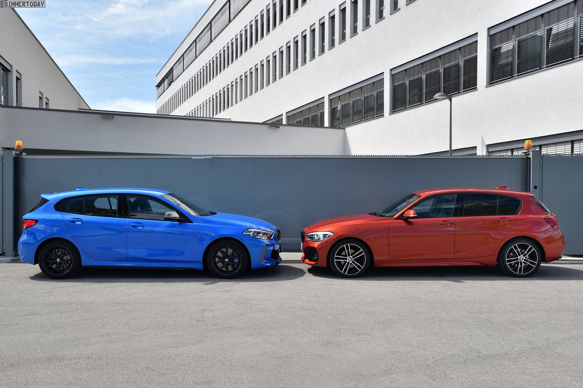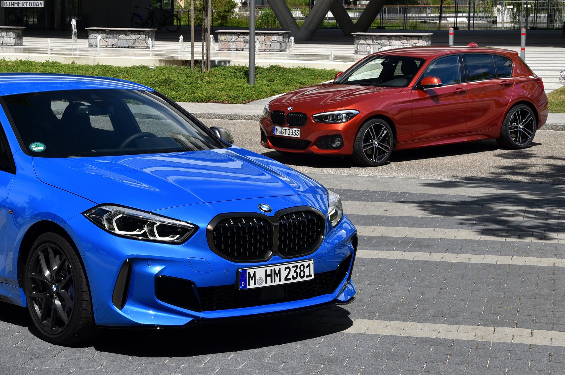 The technical background of the slightly different proportions is not visible: While the BMW 1 Series F20 in Sunset Orange carries its engine under the bonnet and thus primarily drives the rear wheels, the engine of the BMW 1 Series F40 is mounted transversely to the direction of travel and controls the front wheels. Although they are both on request with xDrive.