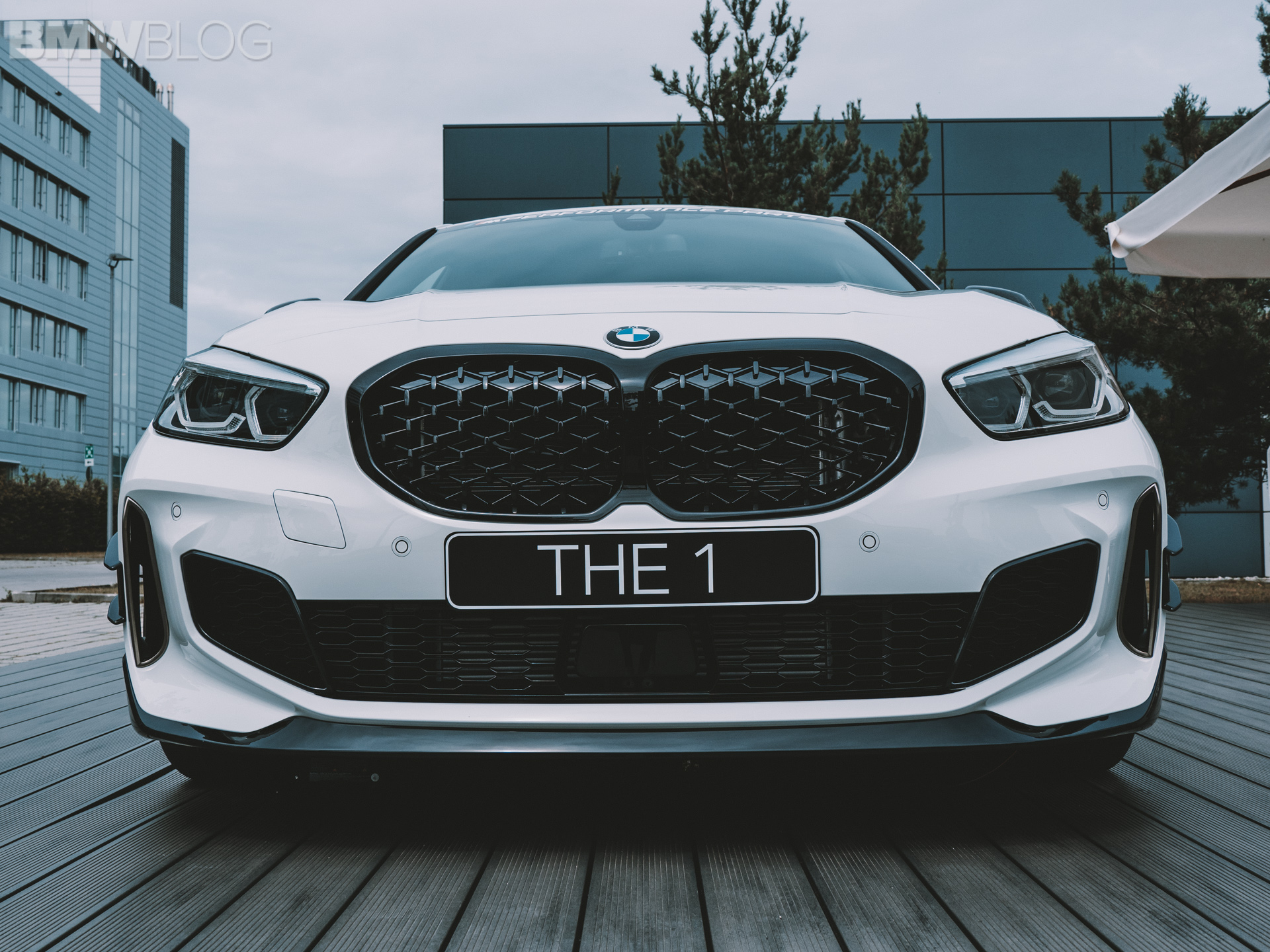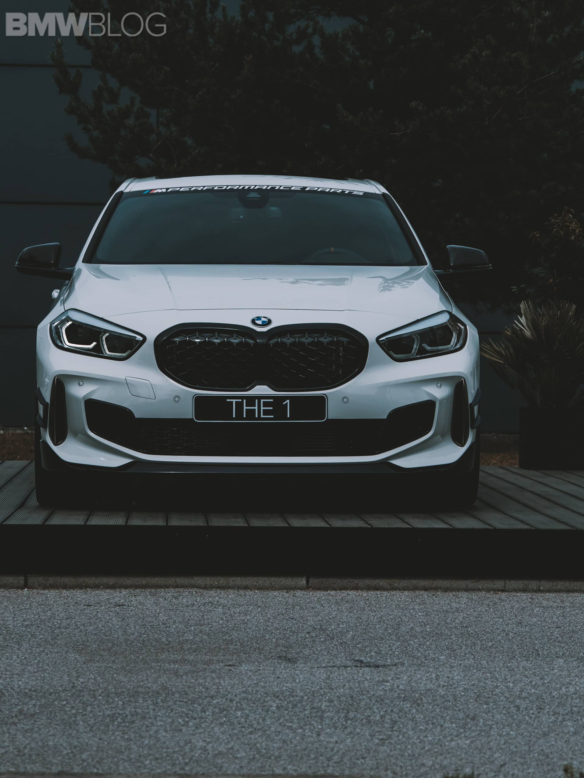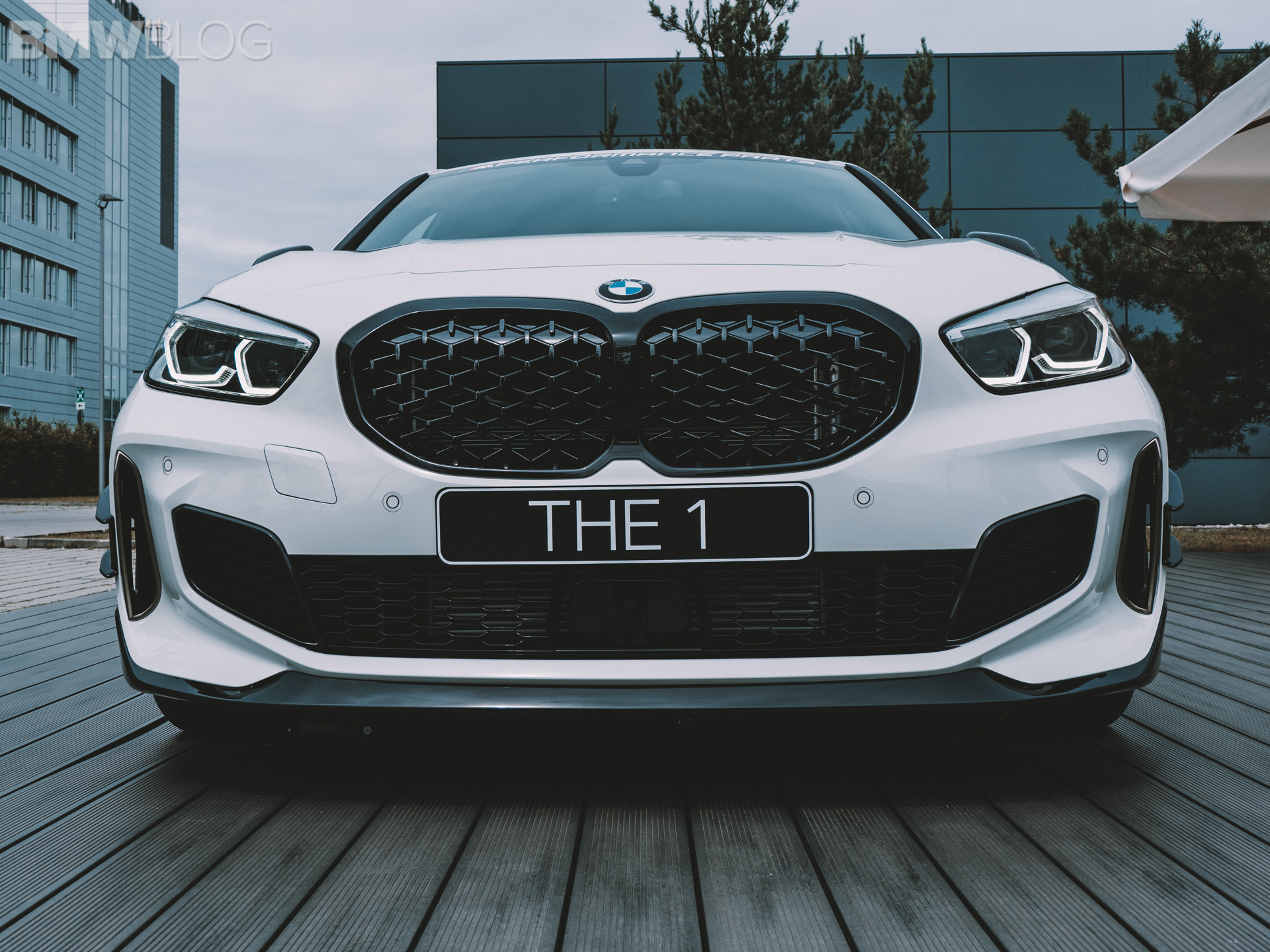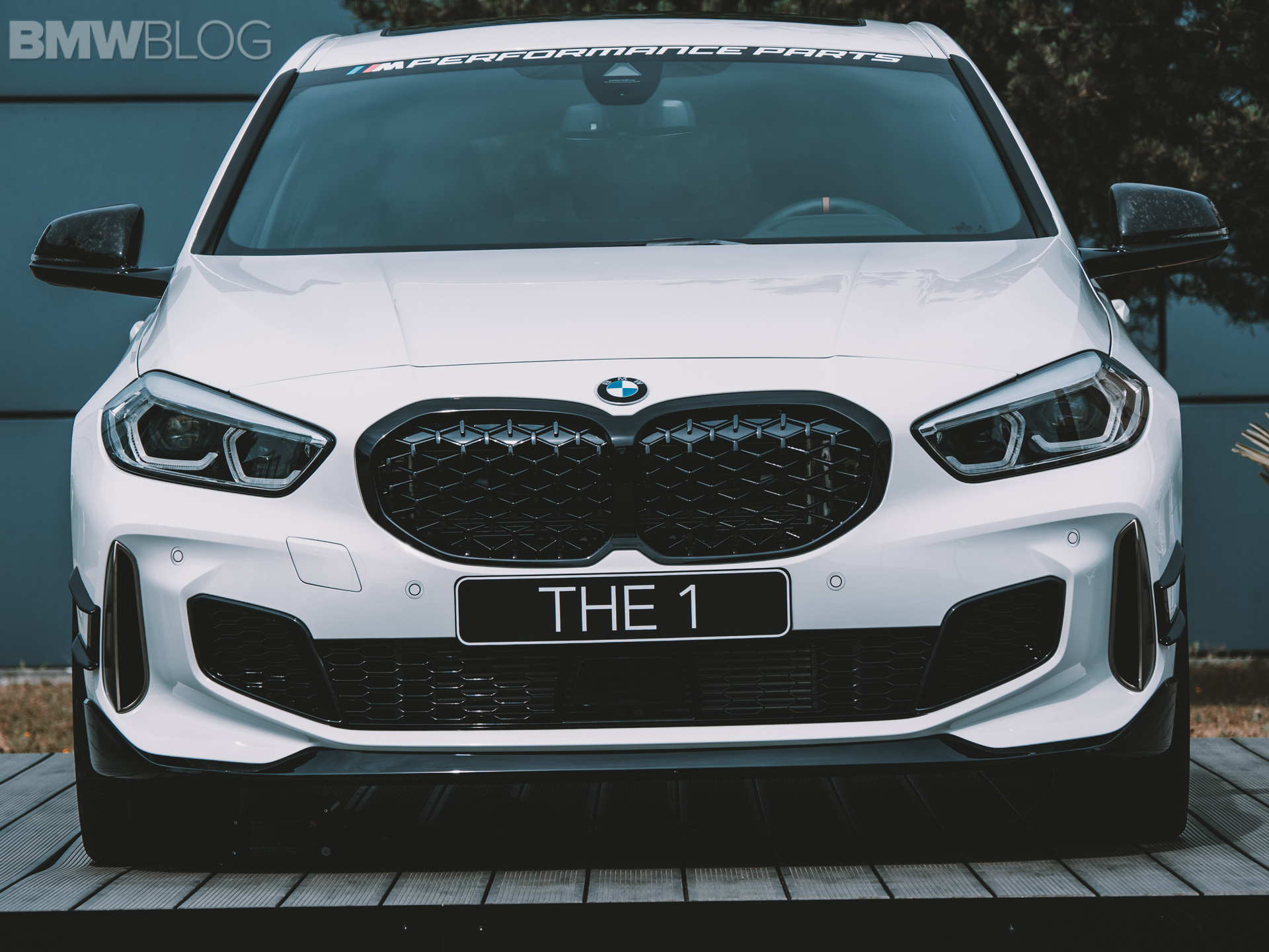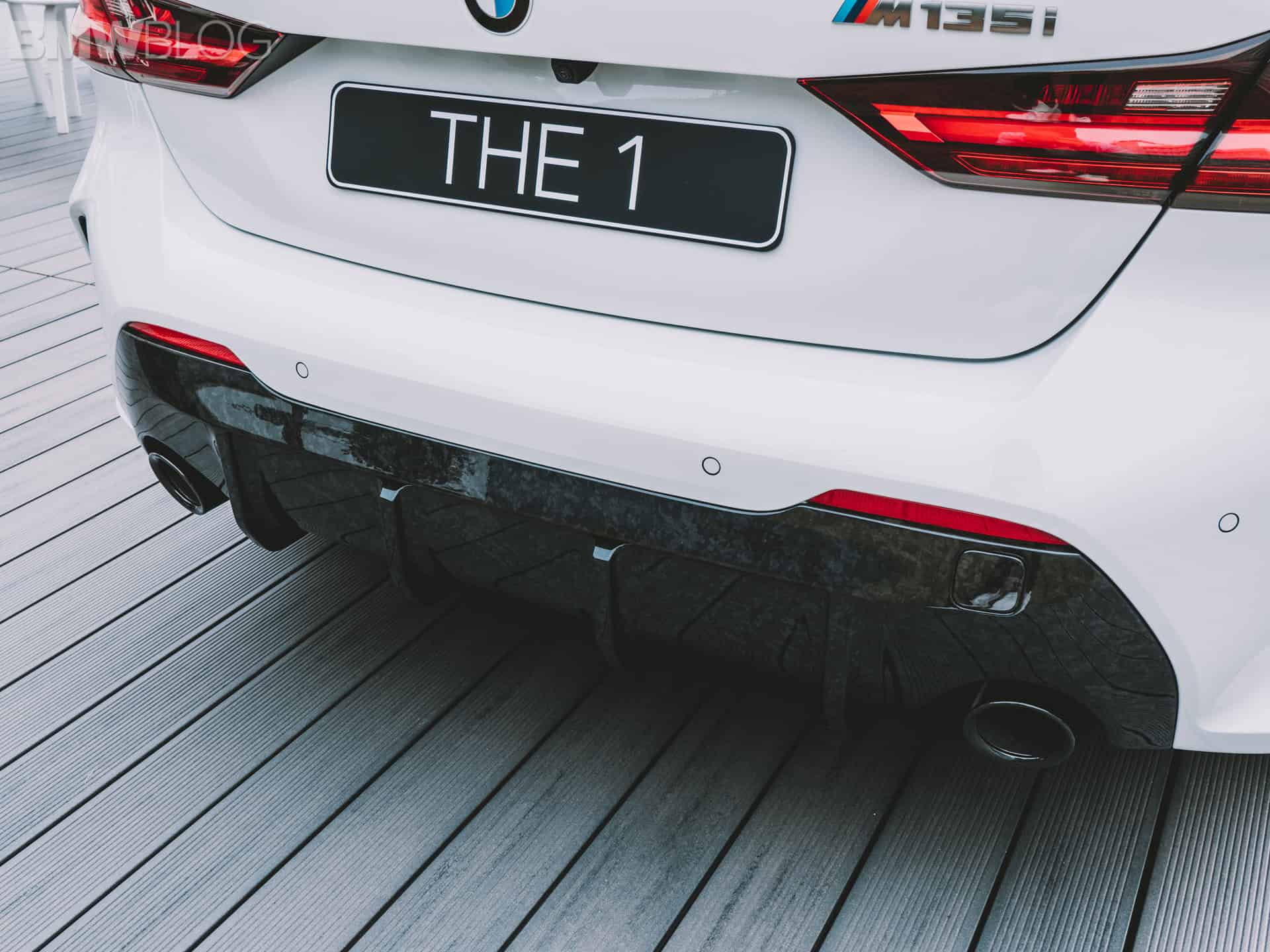 The 1 Series shown here features a carbon pressed front splitter, as well as horizontal-flow rear spoiler and the aero flicks in high-gloss black optimize aerodynamics. There are also high-gloss black side sill inserts and the rear diffuser is also made of pressed carbon fiber.