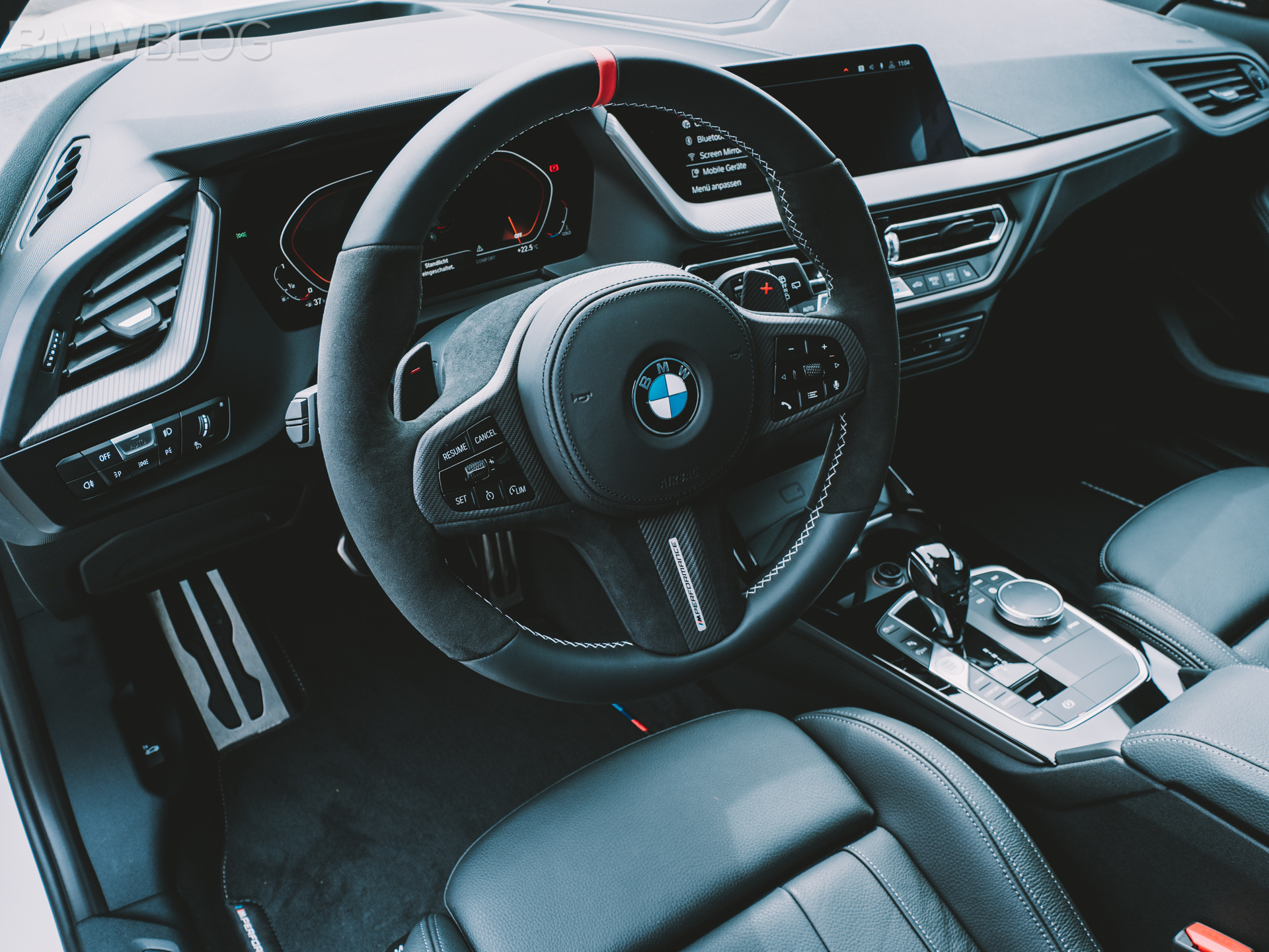 Inside, BMW has added the M Performance steering wheel with Alcantara grip area. In addition, visual accentuations are provided by the red marking at the 12 o’clock position and the silver-grey hand-sewn cross-stitching.