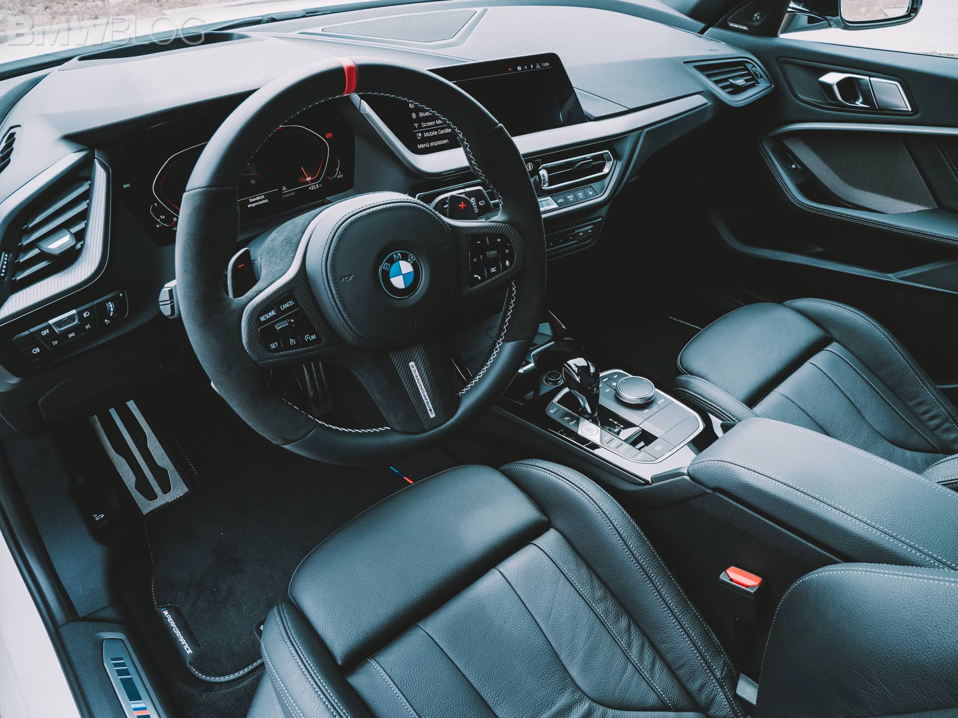Inside the BMW M135i, the only real change from the M Performance Parts catalog is to the steering wheel. It features Alcantara at the 9 and 3-o’clock positions and a little red stripe at 12-o’clock. Though, the M135i doesn’t really need much sprucing up inside, as its cabin is already quite sporty. It might not be the flashiest cabin, especially in black, but it still looks good and build quality is great for its segment.