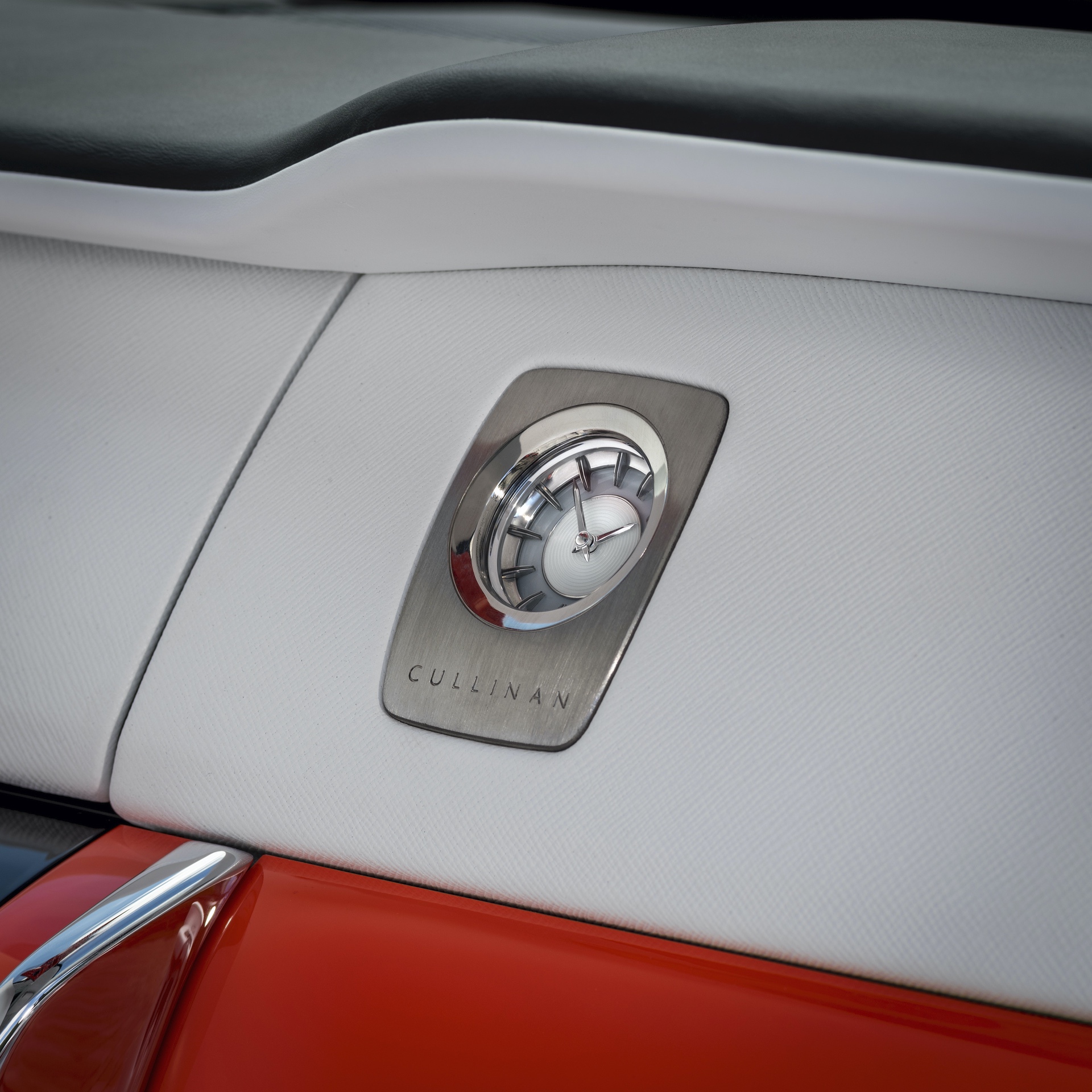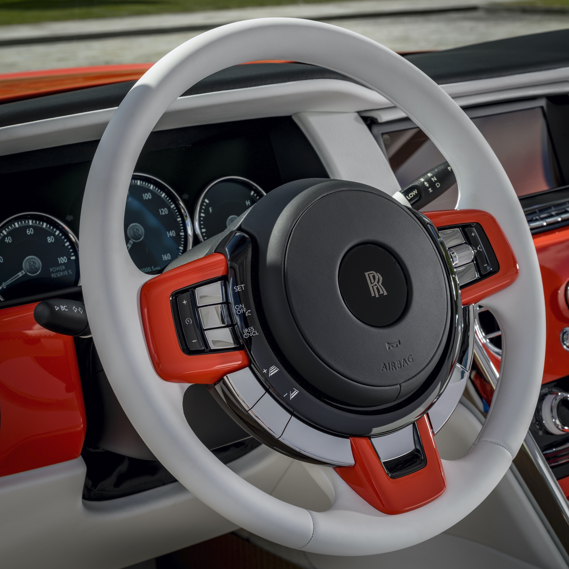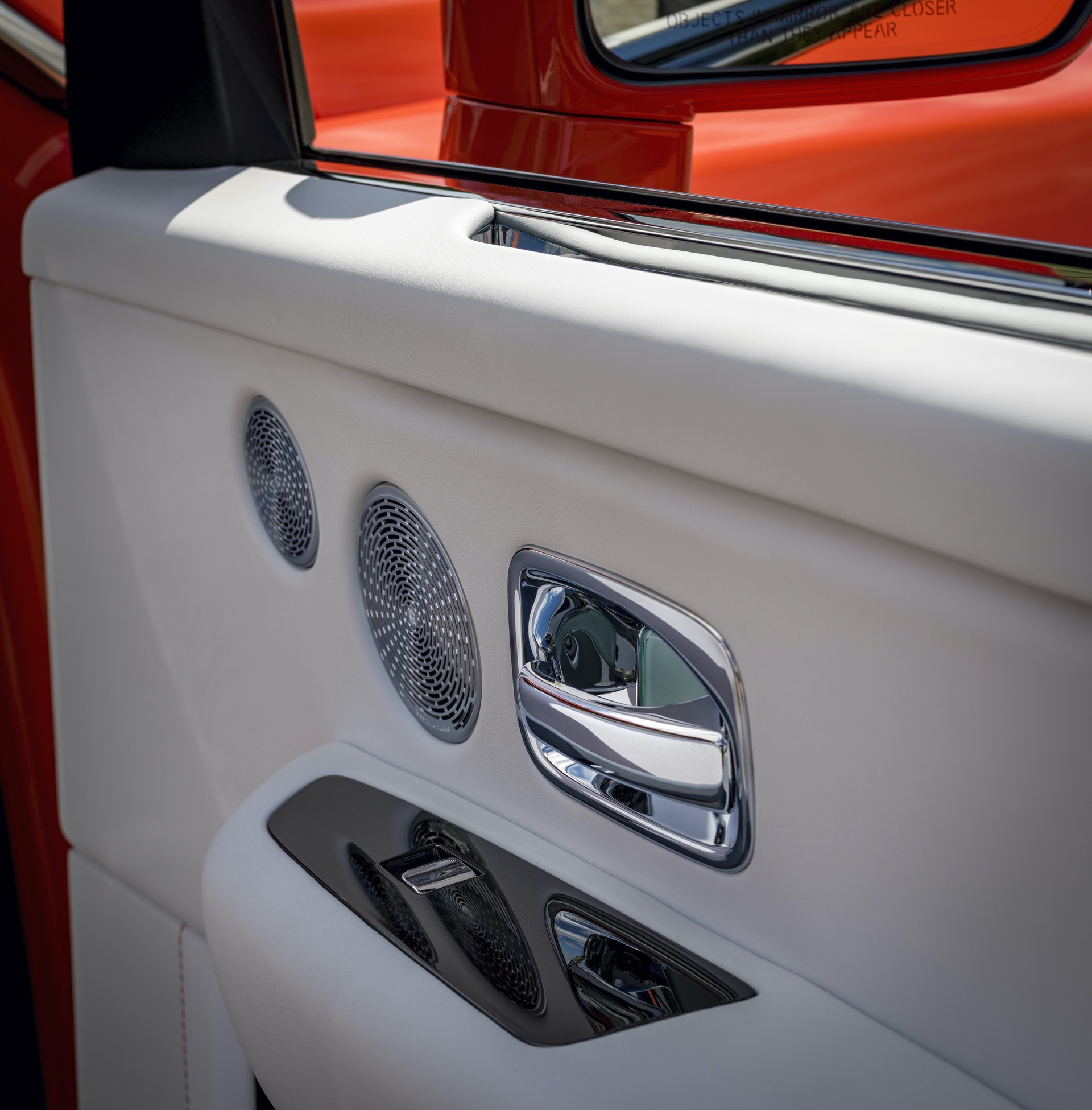 The interior is decked in hand-crafted Arctic White leather with offsetting Orange stitching and Orange Rolls-Royce “RRs” on the headrests. Arctic White is carried over to the luxurious box grain leather fascia, steering wheel control stems and carpets. The designers brought color contrast with “Fux Orange” finished fascia veneer, rear-view mirror and lambswool floor mats.