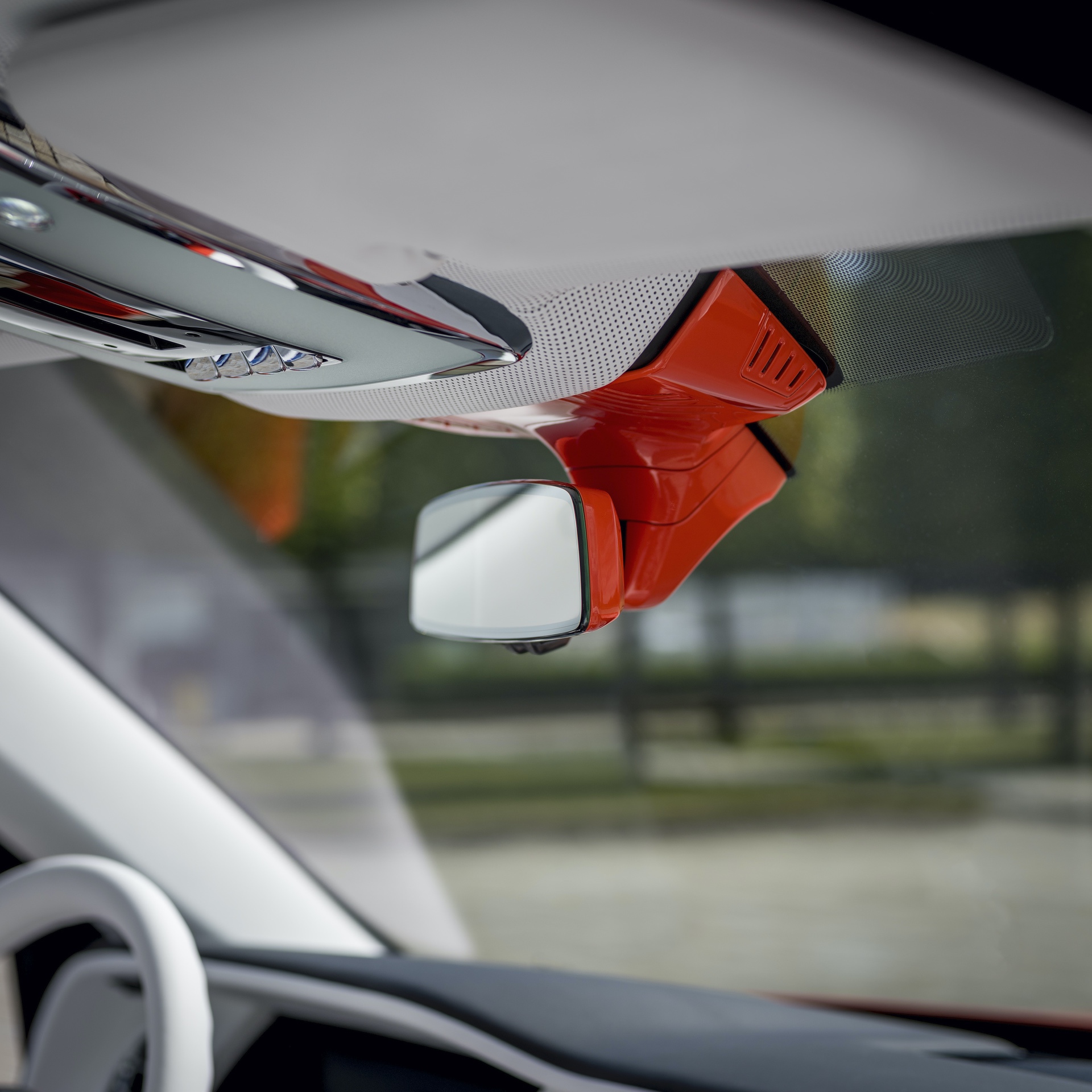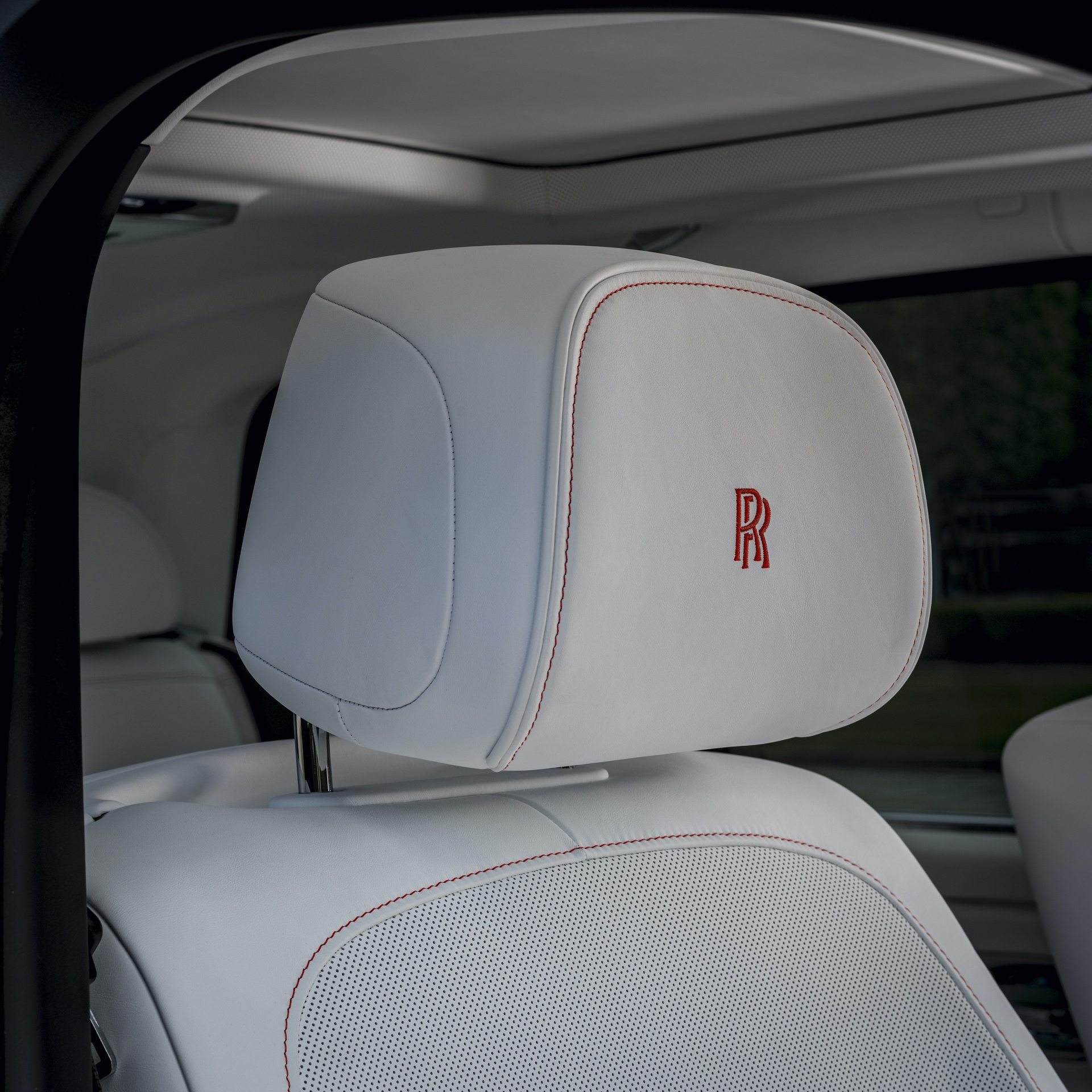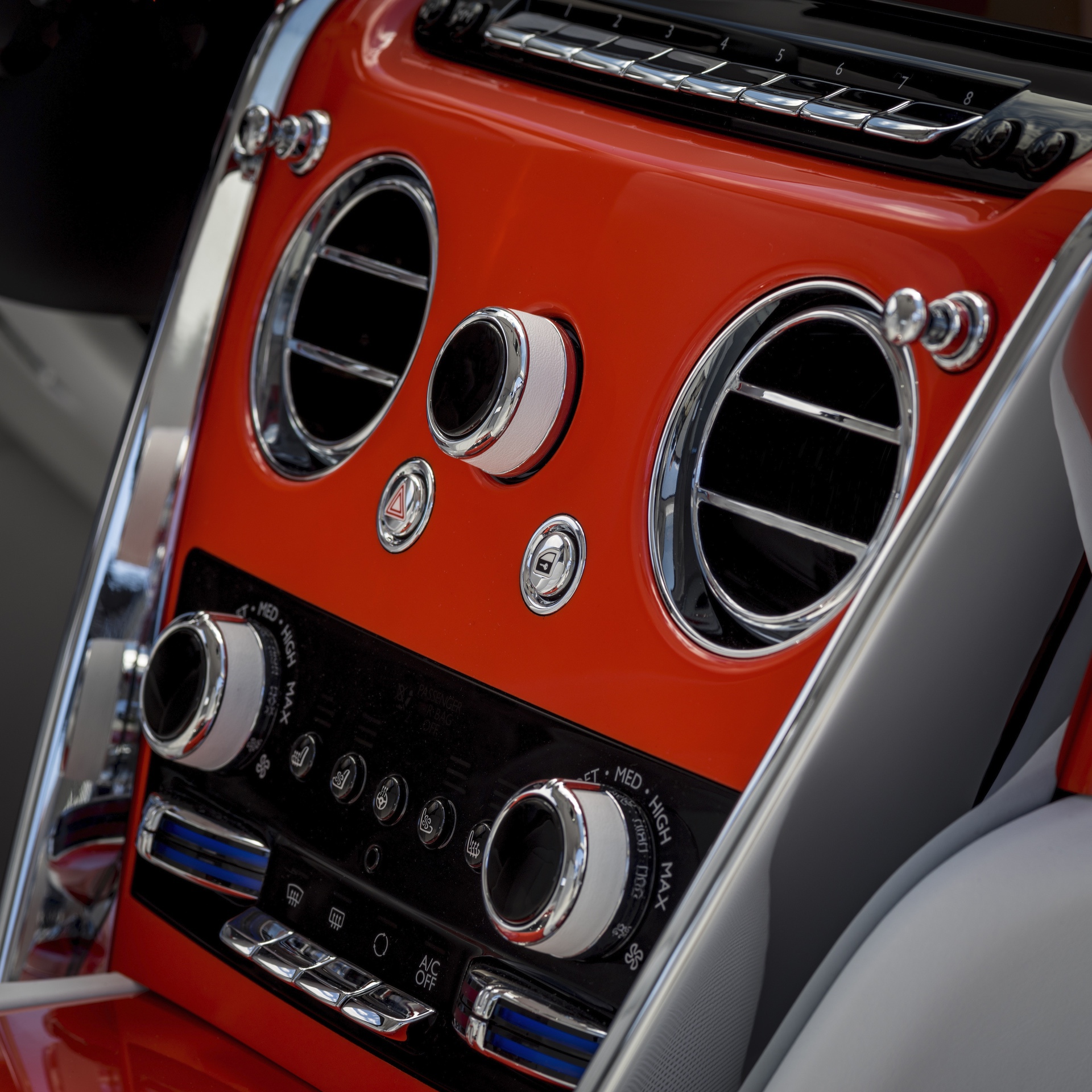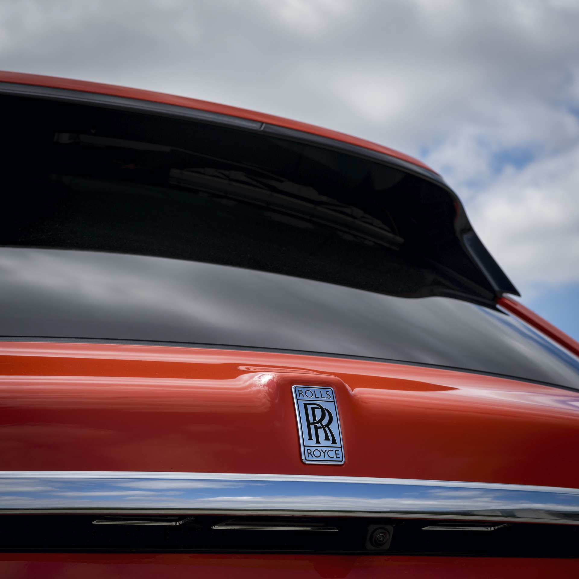 The interior is decked in hand-crafted Arctic White leather with offsetting Orange stitching and Orange Rolls-Royce “RRs” on the headrests. Arctic White is carried over to the luxurious box grain leather fascia, steering wheel control stems and carpets. The designers brought color contrast with “Fux Orange” finished fascia veneer, rear-view mirror and lambswool floor mats.