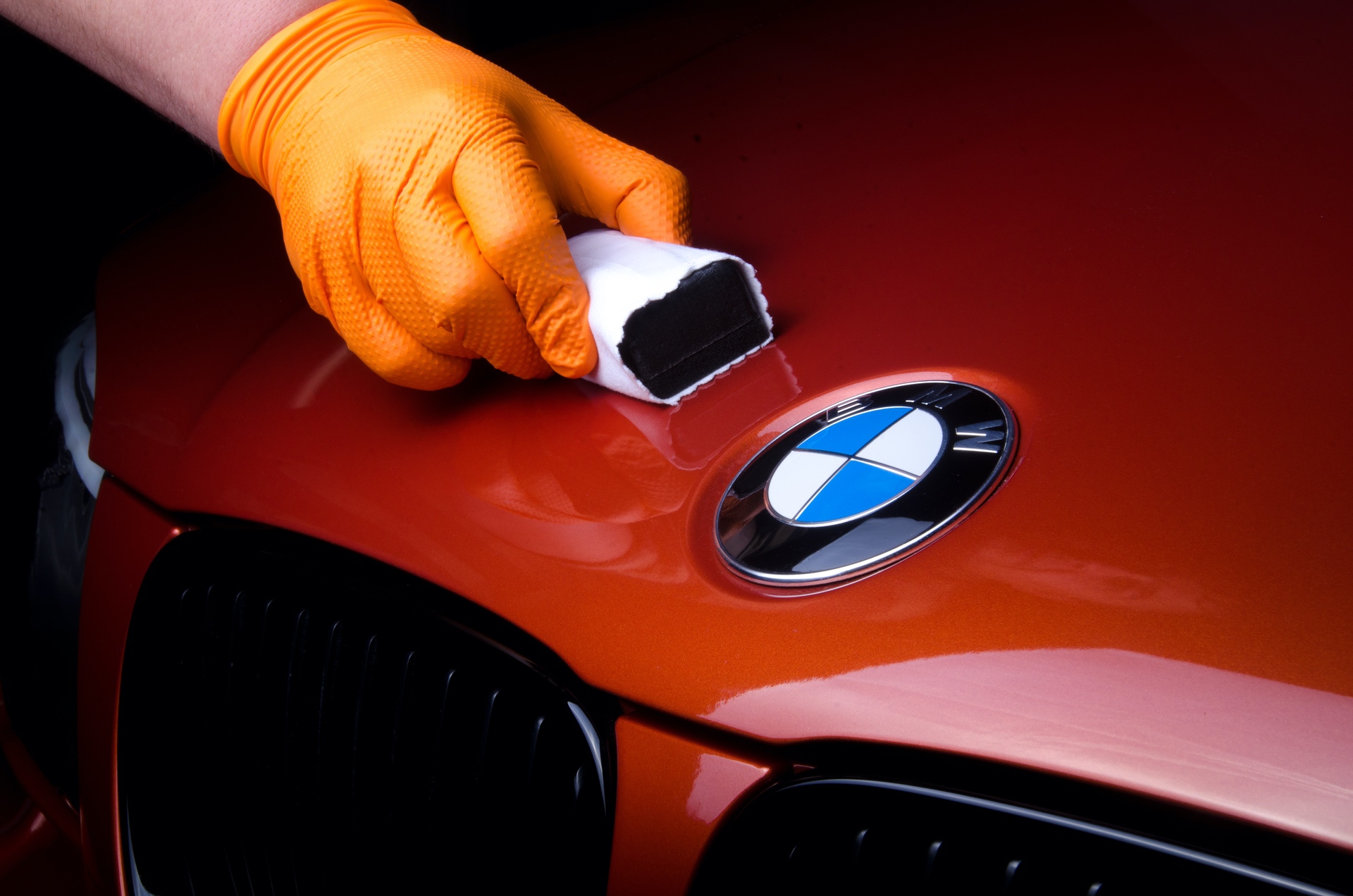 First step is to prepare the initial panel with Paint Coating Prep, spraying and wiping to lay anchor points for the coating to bond with. Then using the pipette, the detailers place 7-10 drops of Nano-Resin Pro on a suede cloth-wrapped foam block applicator. The panel is then coated, getting full coverage through use of a crosshatch application pattern. After the panel is complete, they thoroughly wipe down after 30 seconds to a minute.
