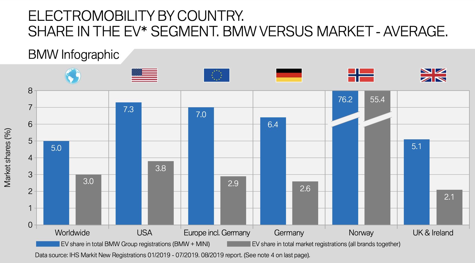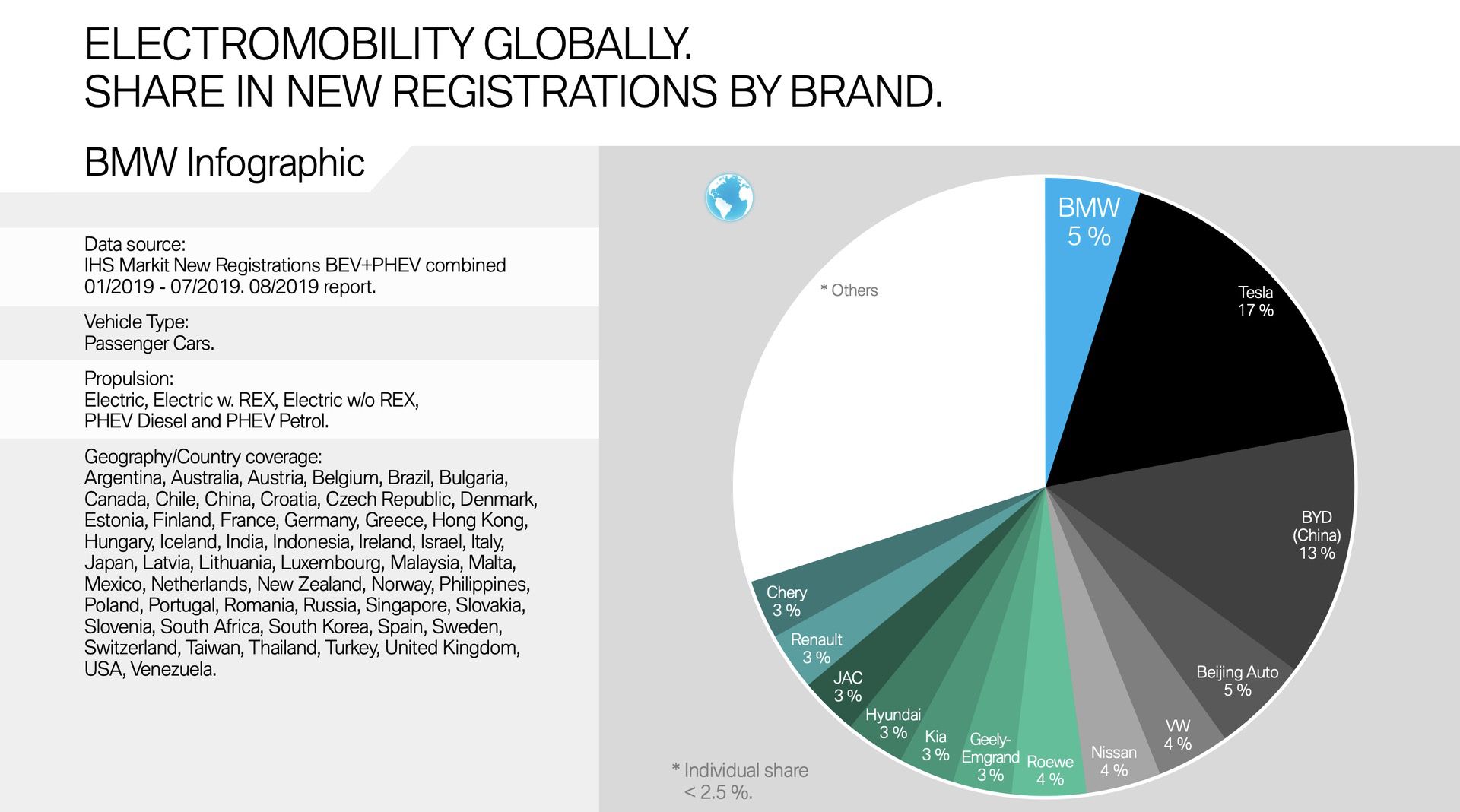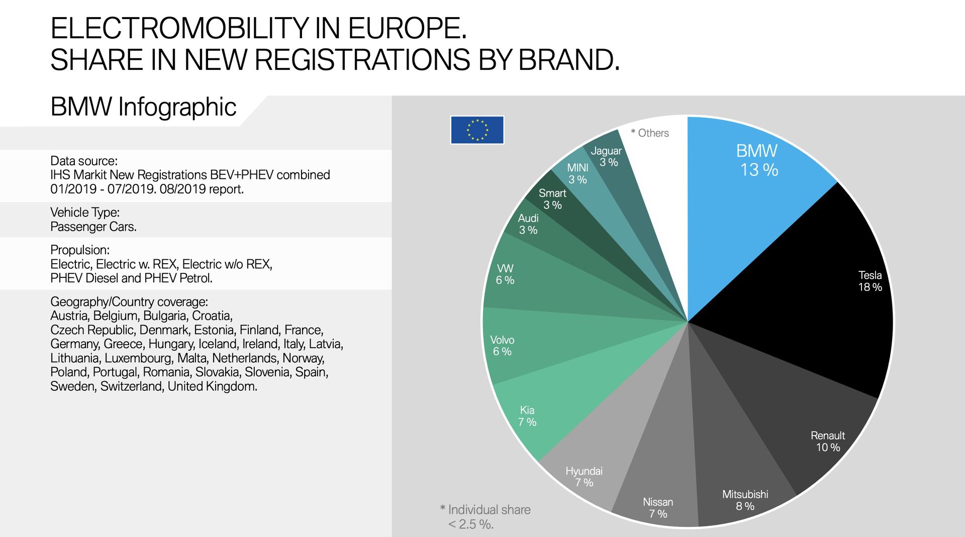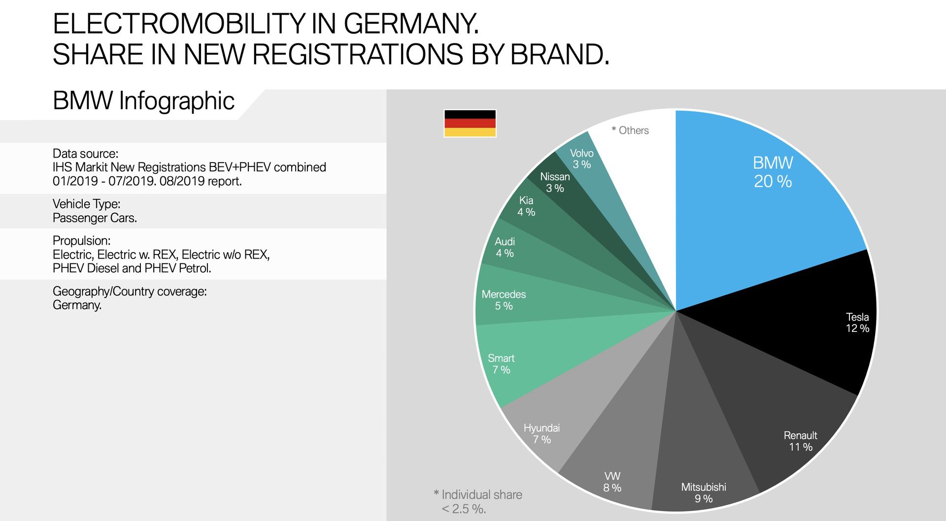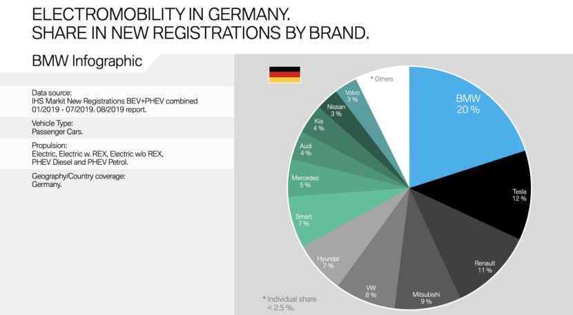 Although July 2019 was rather a transitional month for BMW electric cars and plug-in hybrids, the Bavarians were able to further increase its electric market share in Germany. In the first half of the year, 19 percent of all newly registered vehicles in Germany had BMW electrified engines. By July, the number increased to 20 percent. In contrast, Tesla, Renault and Mercedes reported declines, while Audi remained at 4 percent and VW gained one percent.