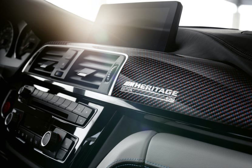 Furthermore, there are also interior carbon trim strips designed exclusively for the BMW M4 Edition M Heritage. Both the interior trim strips and the door sills bear emblems with the imprints “Edition ///M Heritage” and “1/750” as an indication of the limited edition of this model.