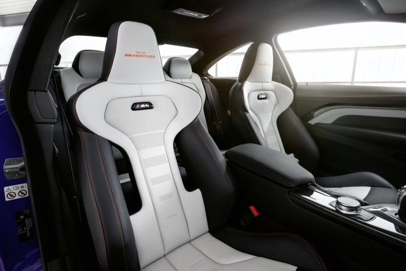 Inside, the special BMW M4 Edition M Heritage features full leather M seats in a bicolor design. Each seat color is oriented towards the exterior paint and is complemented by partly bicolored contrast stitching.