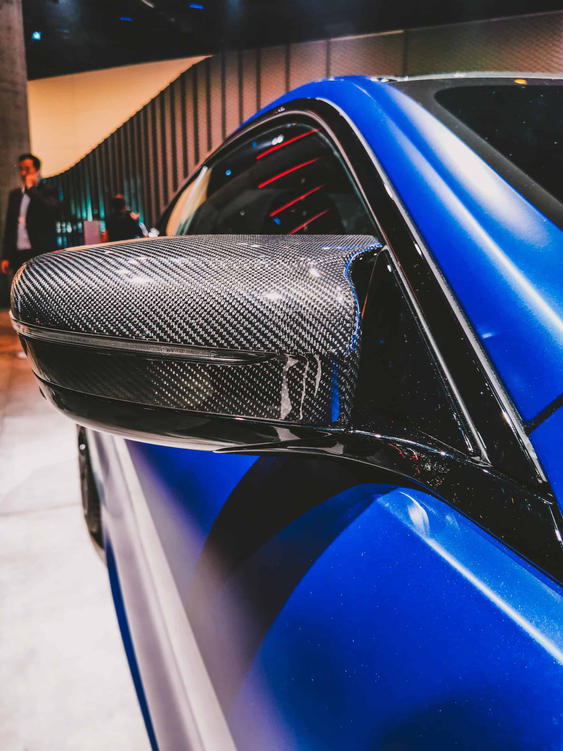 In the interior, the matte blue BMW M8 Coupe wears a BMW Individual composition with merino leather and Alcantara. The carbon fiber interior trim emphasizes the sporty standards and, together with some red details, points to the M-genes of the vehicle.