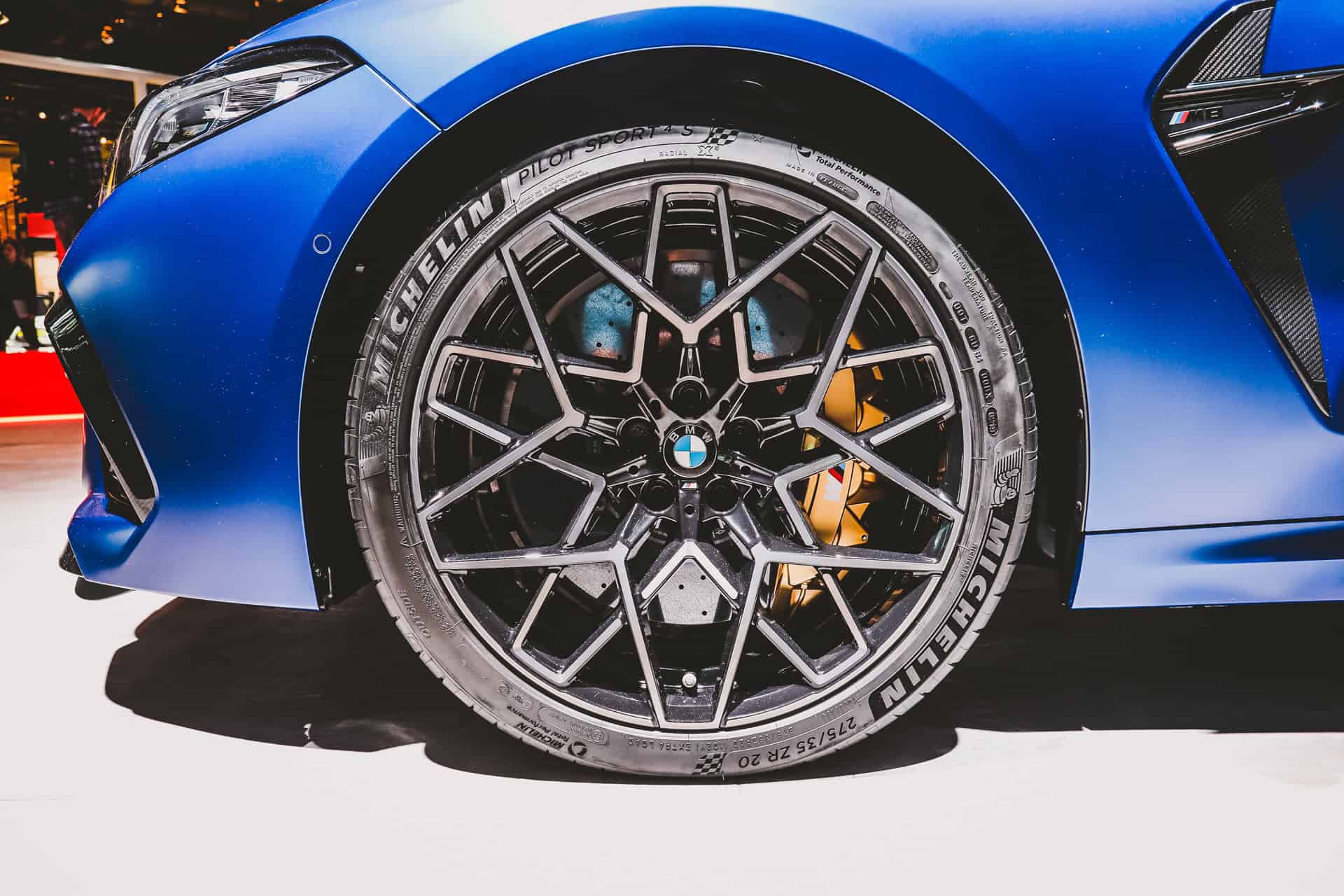 In Frankfurt, the BMW M8 Competition in Frozen Marina Bay Blue presents itself with the 20-inch light-alloy wheels star spoke 813 M Bicolor, which are available as a free-of-charge option.