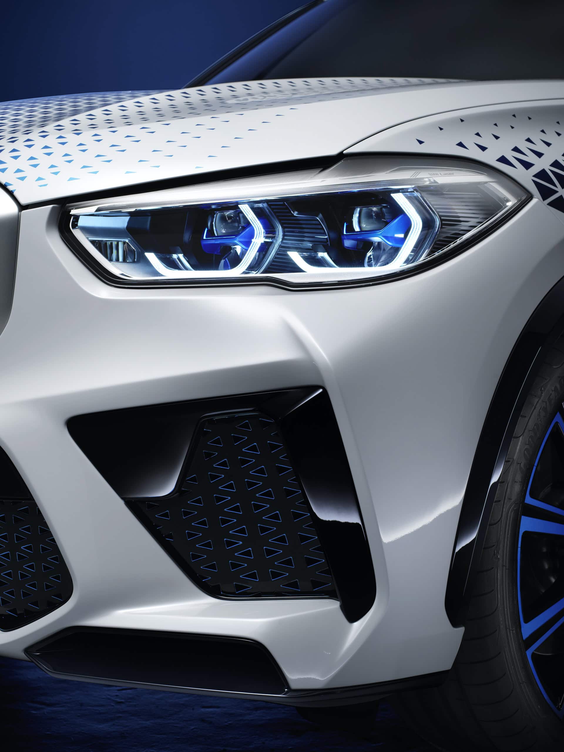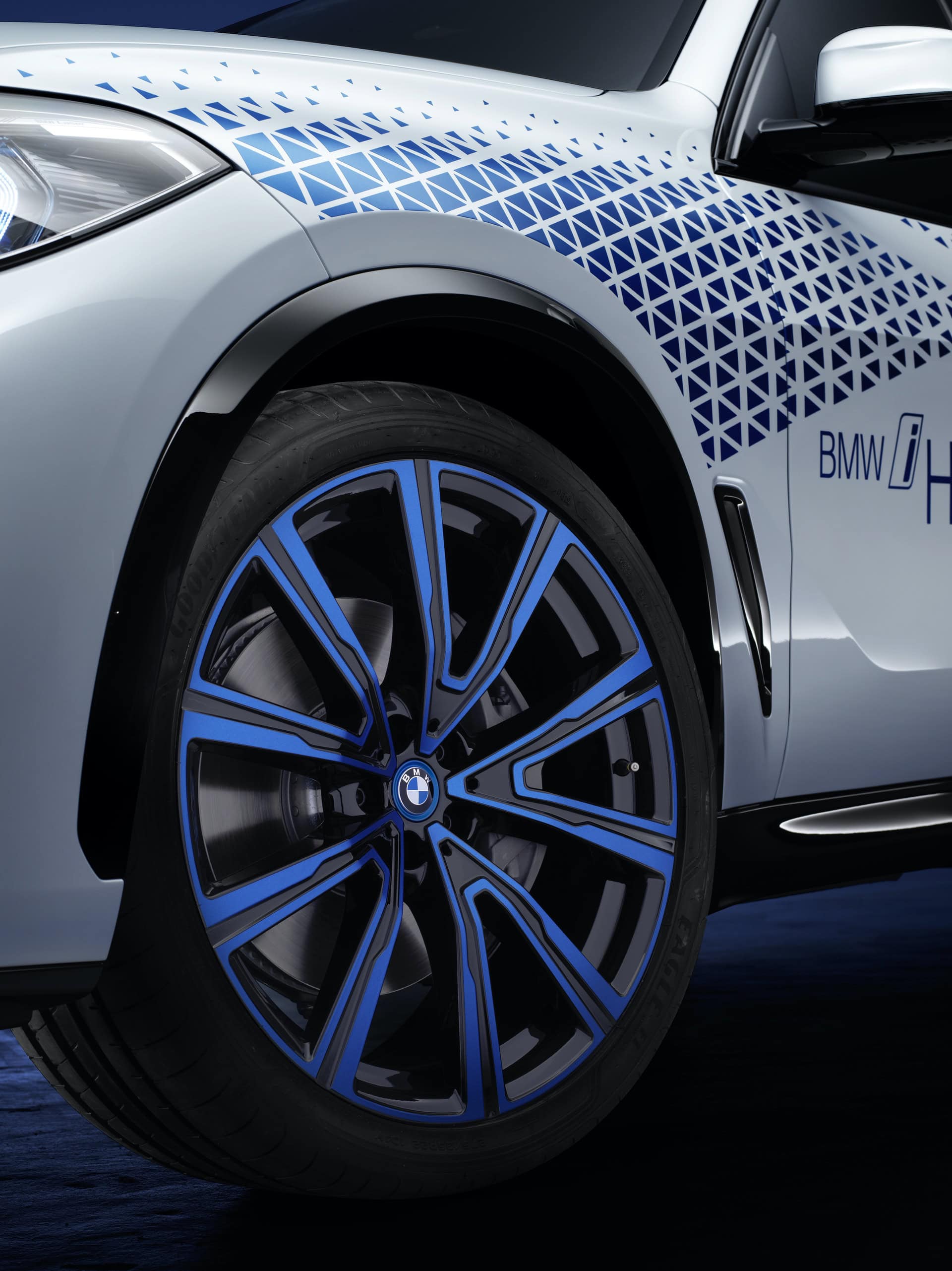 At the front, the blue accents on the kidneys hint at a different type of powertrain, while the rear diffuser elements replace conventional tailpipes. The pattern’s shape and color form a dynamic flow across the front end and flanks of the Mineral White body. The detailing on the light-alloy wheels provides further confirmation of the model’s BMW i genes.