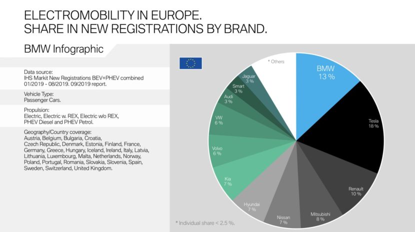 When looking at the entire European Union, for the same period Jan-Sept 2019, BMW ranks second at 13 percent, behind Tesla’s 18 percent market share. Audi’s new registrations for electric and hybrids cars are reported to be around 3 percent.