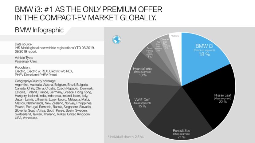 Another interesting graph is the one looking at the premium compact electric vehicles market. BMW touts an 18 percent market share, still behind the Nissan Leaf at 22 percent and Renault Zoe at 21 percent. Yet, BMW does not seem them as direct competitors in the premium market.