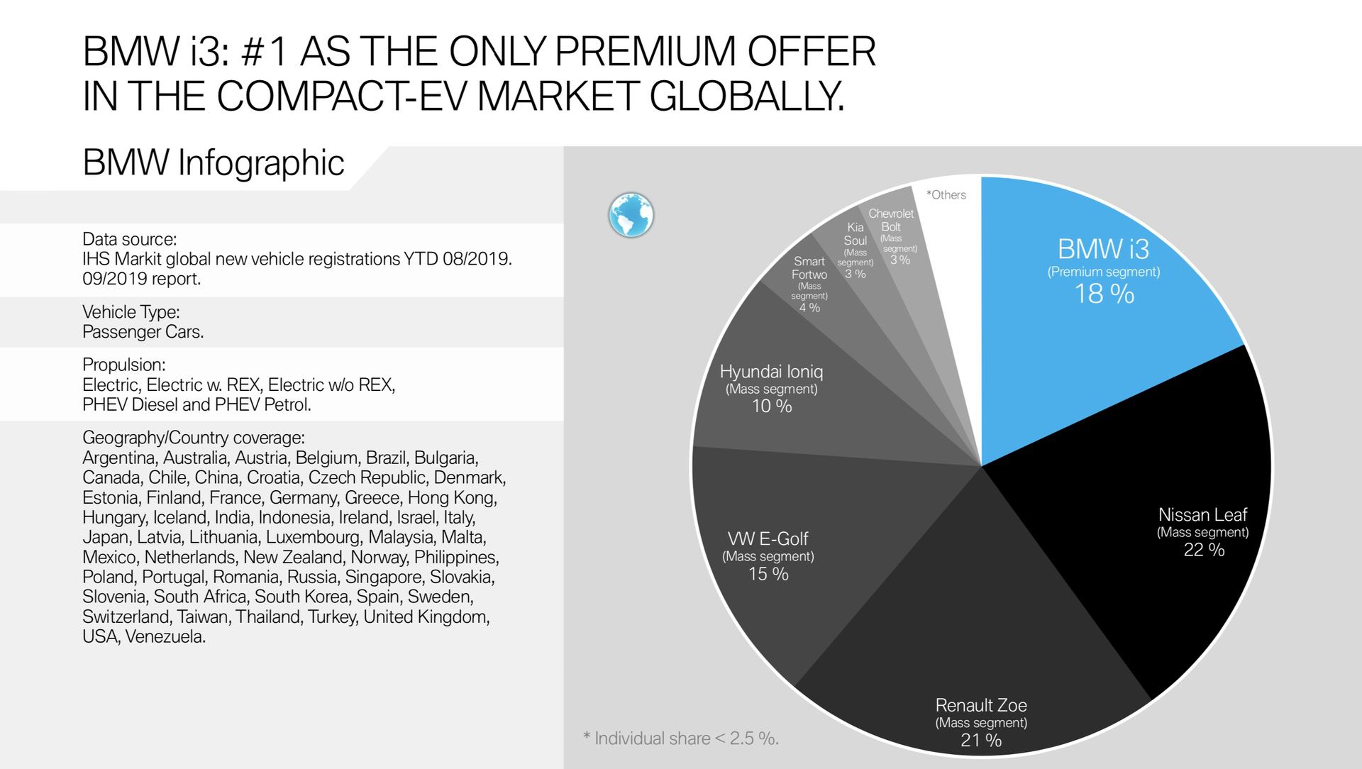 Another interesting graph is the one looking at the premium compact electric vehicles market. BMW touts an 18 percent market share, still behind the Nissan Leaf at 22 percent and Renault Zoe at 21 percent. Yet, BMW does not seem them as direct competitors in the premium market.