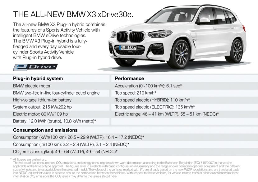 The new x3 xDrive30e is a particularly eco-friendly SAV, with its electrified powertrain enabling a low CO2 footprint of just 64 – 49 grams per km (calculated as per WLTP cycle) or 54 – 49 grams per km (as per NEDC). The fuel consumption is also reduced dramatically to 2.8 – 2.2 liters/100 km (WLTP), which translates into 2.4 – 2.1 liters/100 km (NEDC). The overall electric consumption tops 29.9 – 26.5 kWh/100 km in WLTP paradigm, or 17.2 – 16.4 kWh/100 km transposed into NEDC values. The all-electric range is estimated around 46 – 41 kilometers (WLTP) / 55 – 51 kilometers (NEDC).