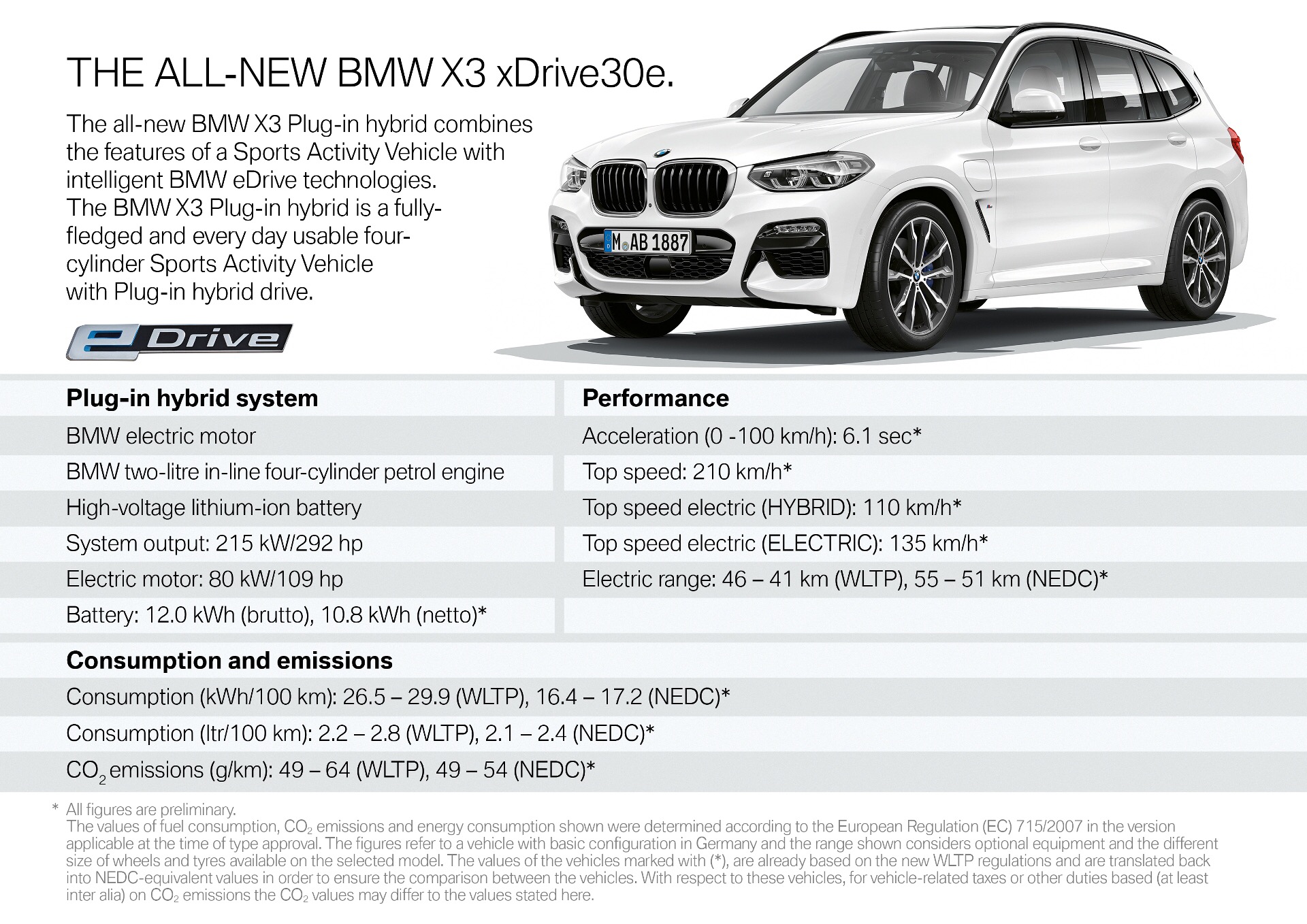 The new BMW X3 xDrive30e combines the all-wheel-drive, electronically-controlled xDrive chassis with the latest, state-of-the-art plug-in hybrid technology, making use of a high-voltage, lithium-ion battery with the most advanced battery cell technology.