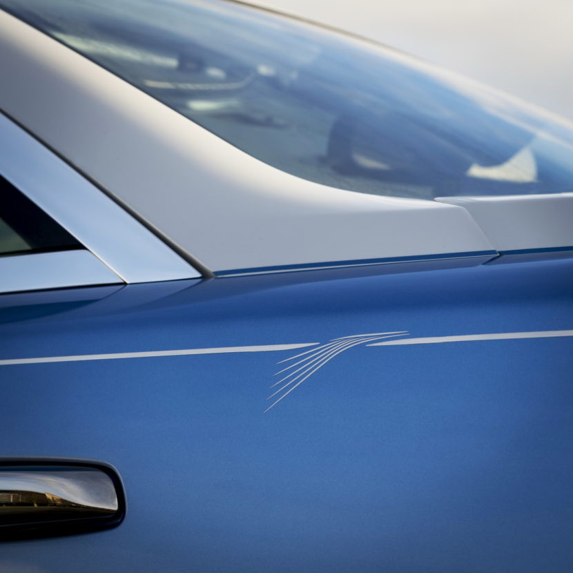 The intricate embroidery puts the peregrine falcon in its natural habitat: the sky. The background of the headlining is finished in pale blue color. As well, the exterior of the car is adorned in Bala Blue and Andalusian White colors. The graphic motif of falcon’s wing is artistically painted between the two rear seats and on the car’s exterior white-painted coachline.