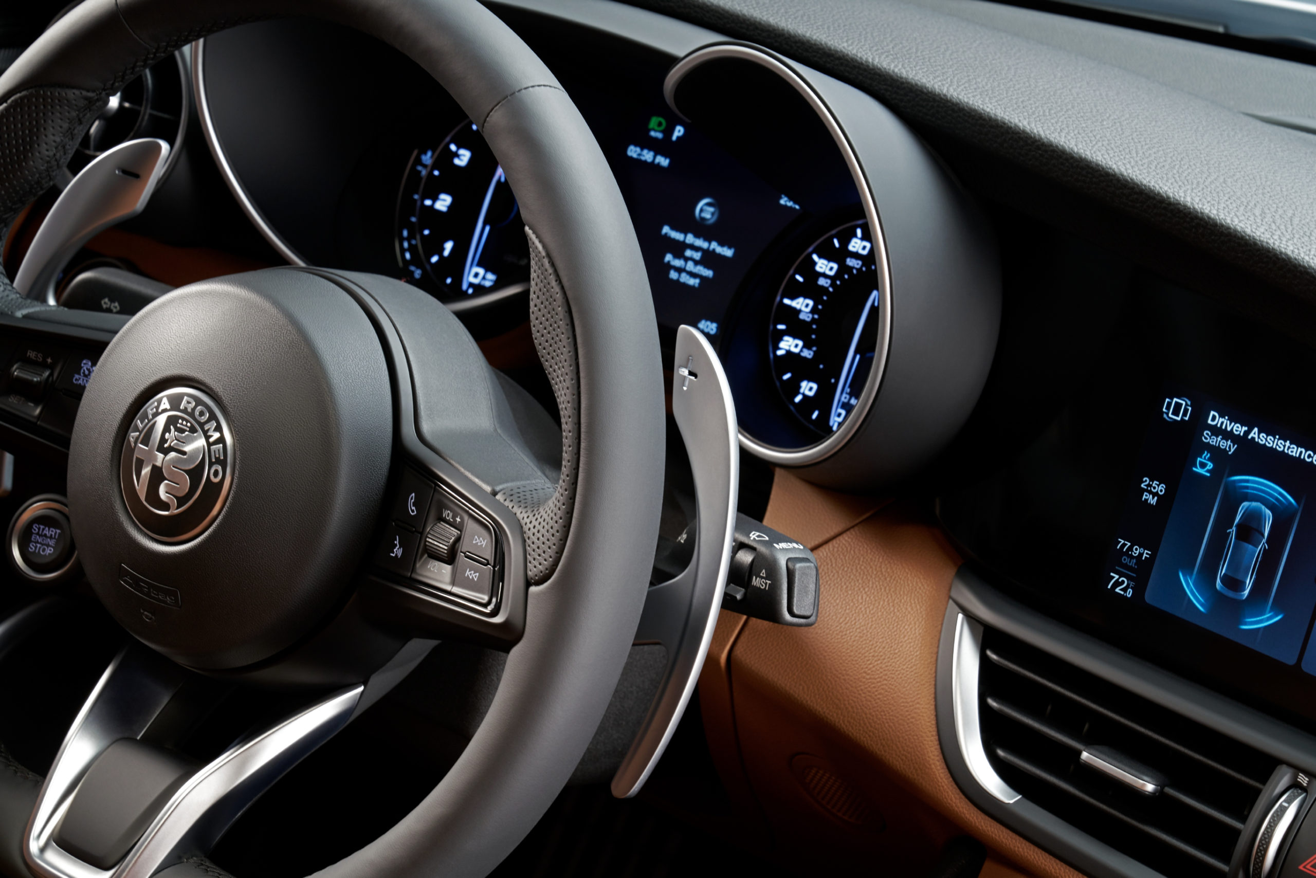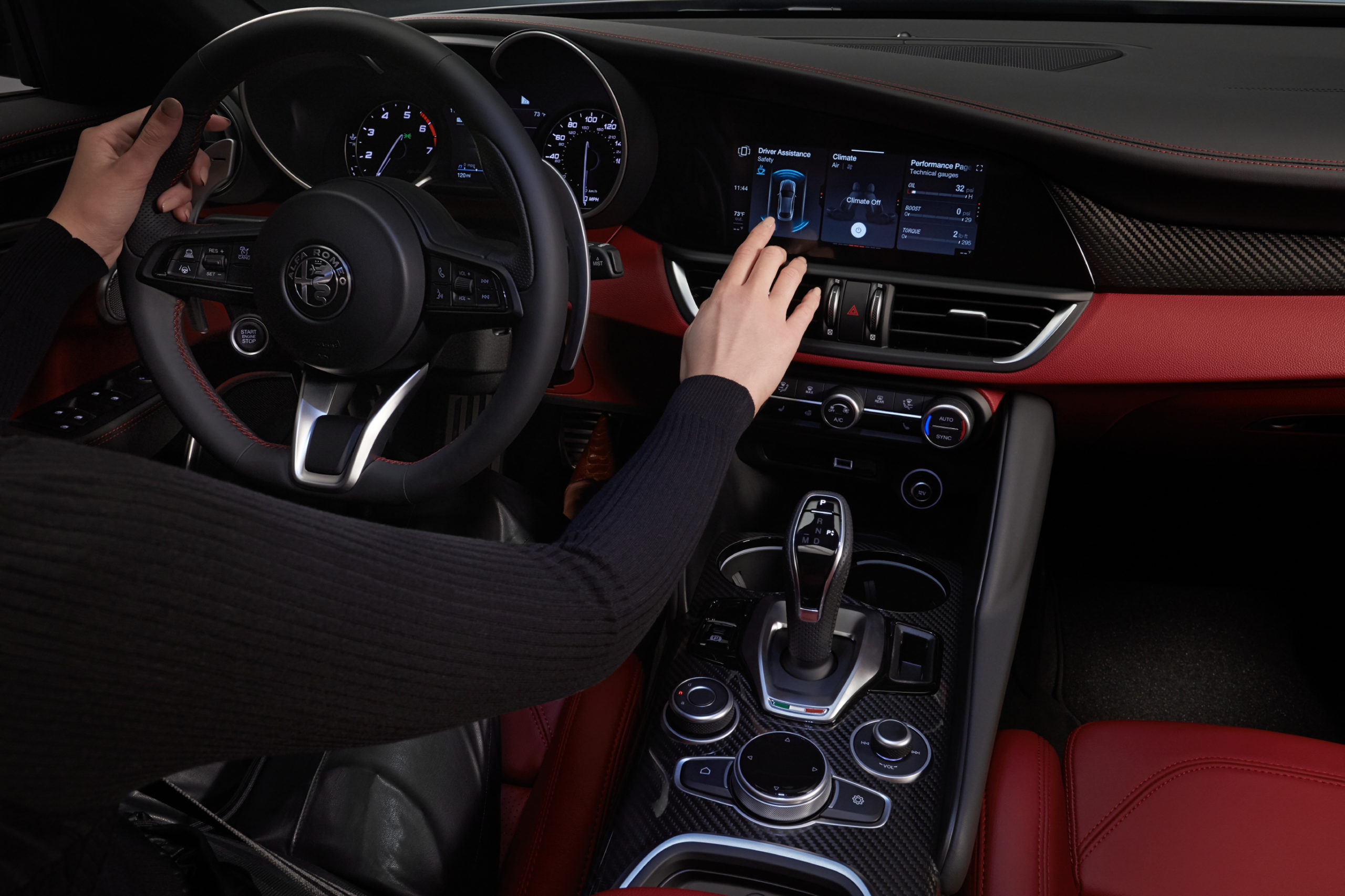 What has changed is the interior and the few details that are changed, while quite subtle, combine to make a big difference. For starters, and most importantly, the infotainment system is all new. The current Giulia’s infotainment system was, to put it frankly, awful. The screen is dim, low-resolution and filled with confusing sub-menus and tedious controls. Now, it features an 8.8-inch touchscreen that still retains the old swivel wheel controller, which is similar to BMW’s new setup. That swivel wheel has also been updated and looks as if it no longer feels like it’s been made for a child’s toy.