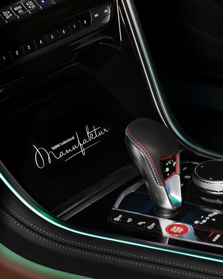 Another unique feature is the BMW Individual Manufaktur which is placed on the exterior front door sills and is repeated inside on the cover door for the phone box compartment at the lower end of the center console.