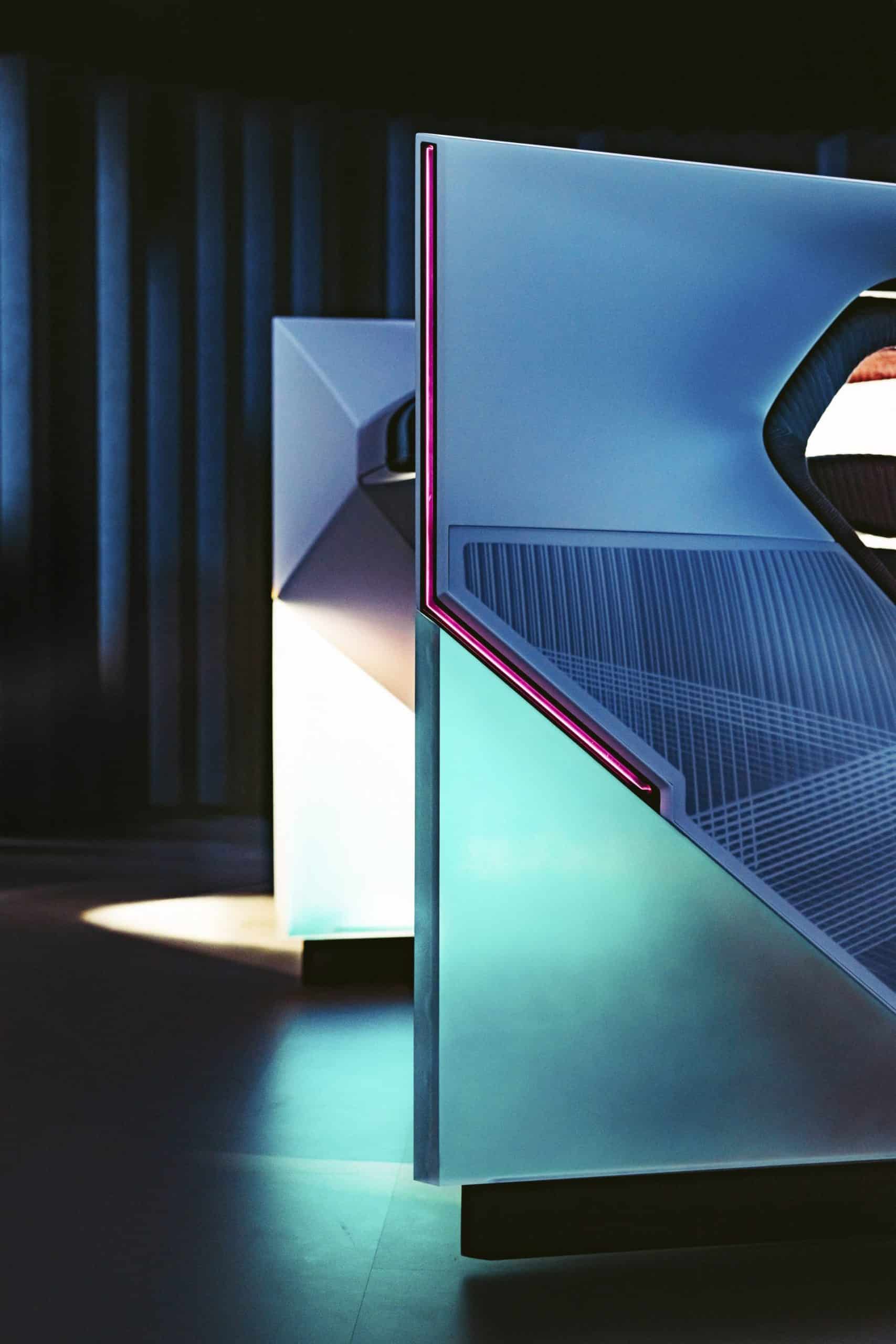 When Ease mode is activated, the vehicle interior offers a more relaxed experience. Touching the intelligent material moves the seat into the “zero-gravity” position. The BMW Intelligent Personal Assistant darkens the Panorama Head-Up Display and makes the surfaces at the sides opaque.