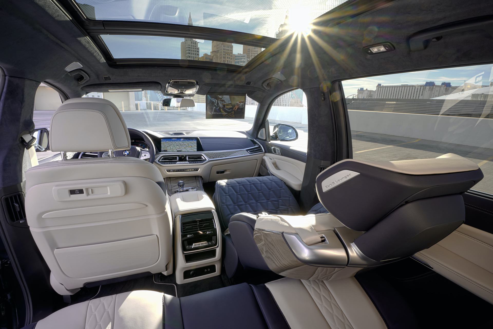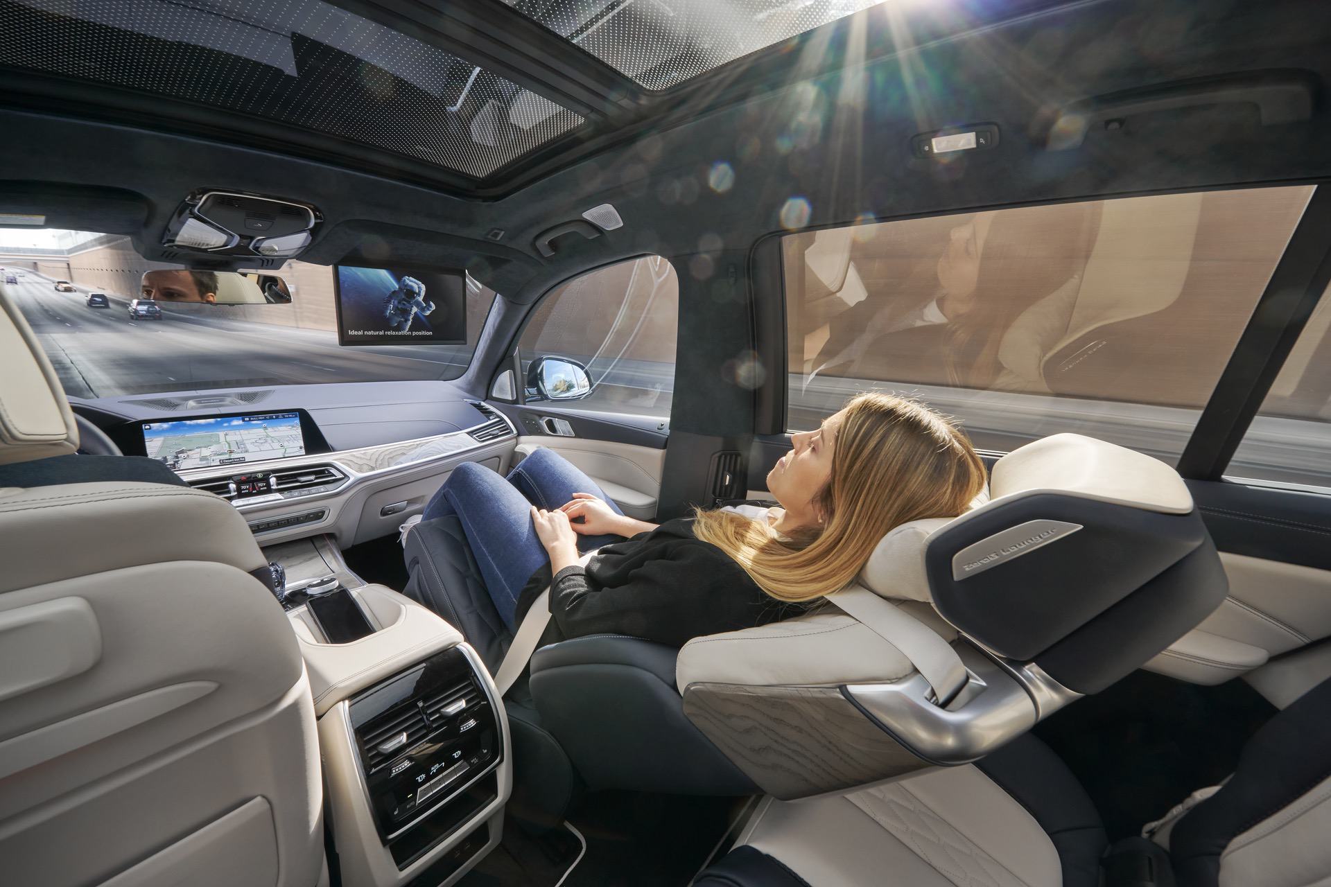 This is a new way of imagining travel, courtesy of BMW. Basically, the BMW X7 ZeroG Lounger models are fitted with luxurious seats that can be tilted back by 40 or 60 degrees into a comfortable reclined position. This, of course, with the goal of offering its occupants the best possible comfort on longer trips. To make sure you don’t miss anything while using the ZeroG Lounger seats, a screen has been built into the headliner, allowing you to watch some on-board entertainment.