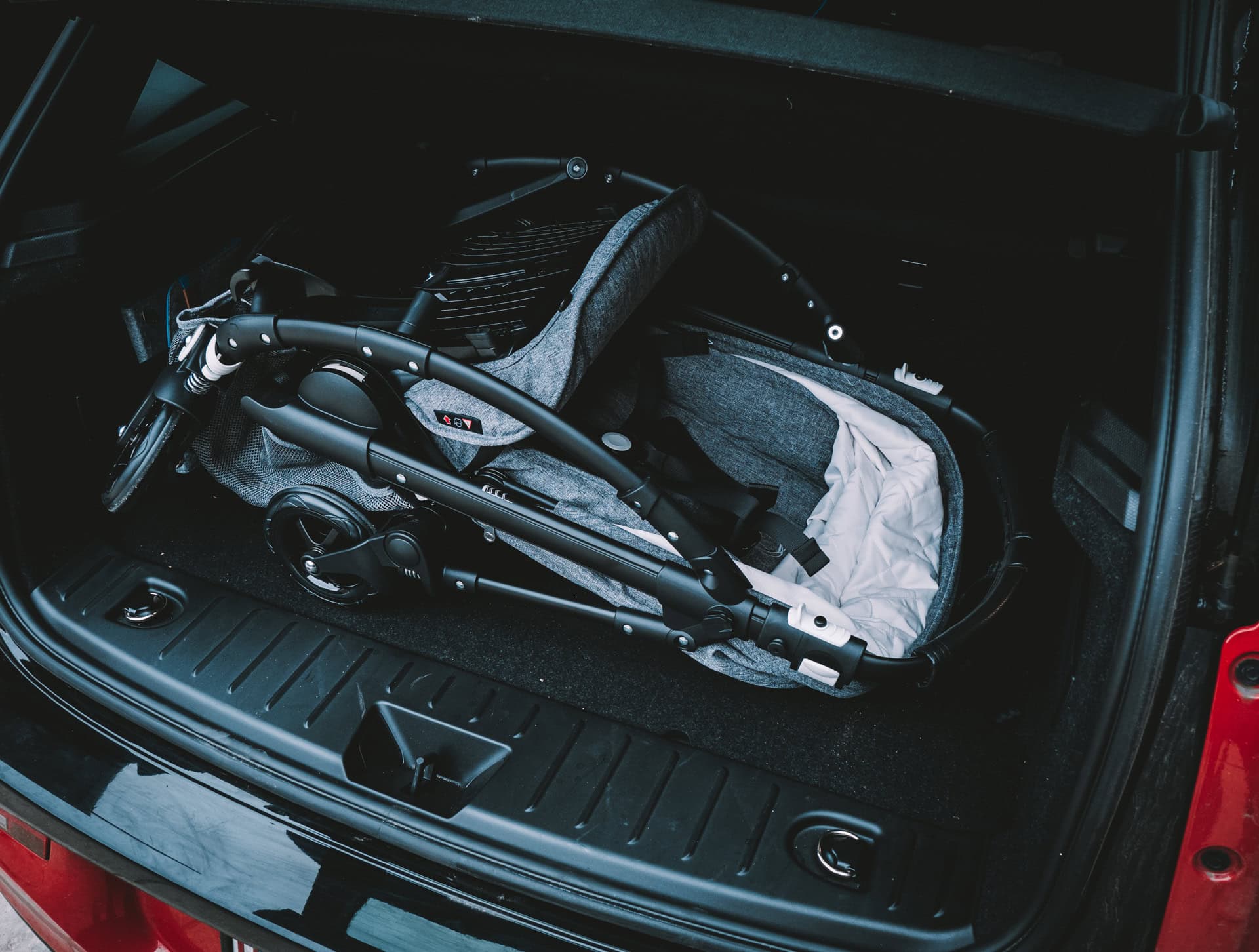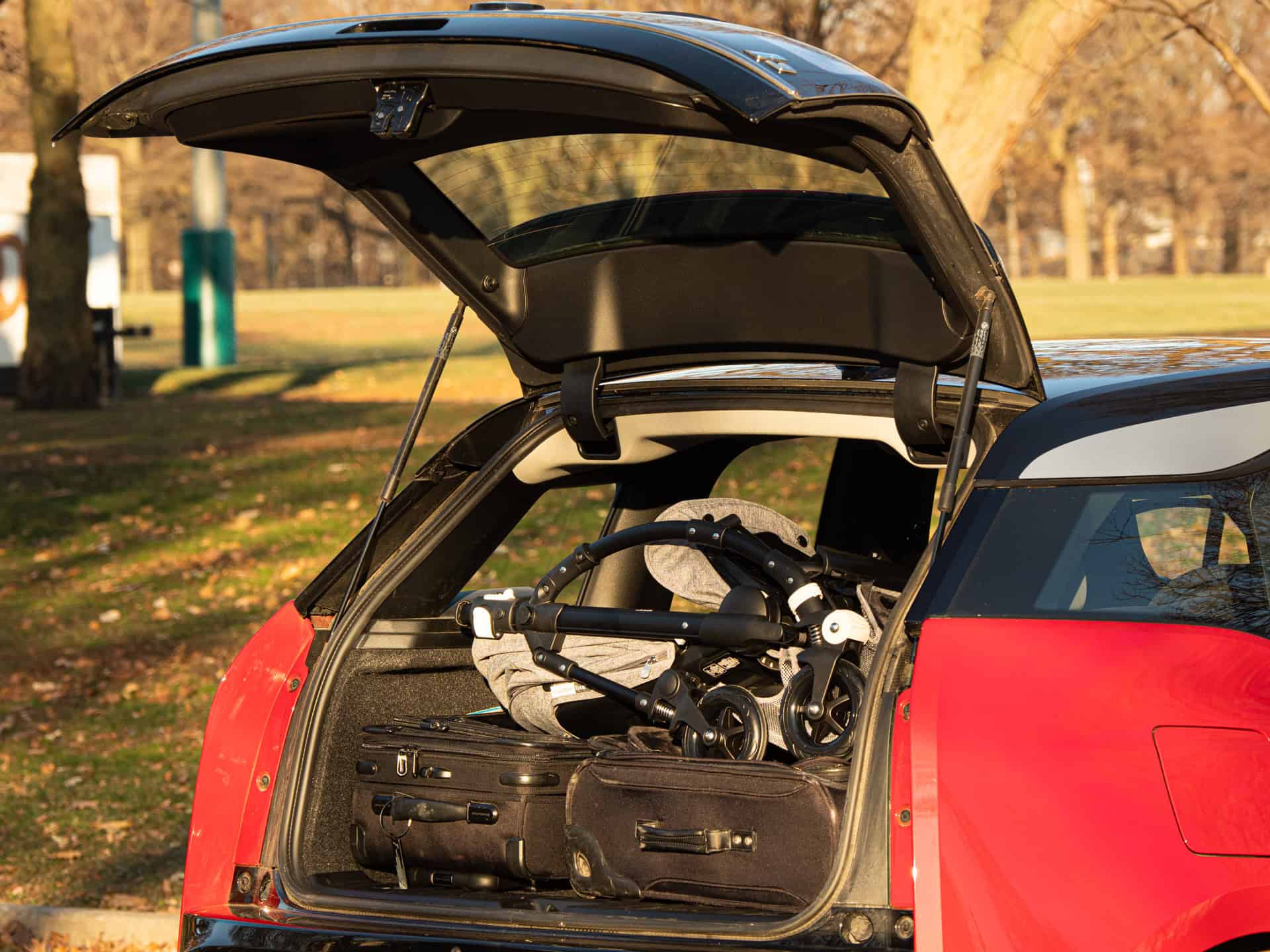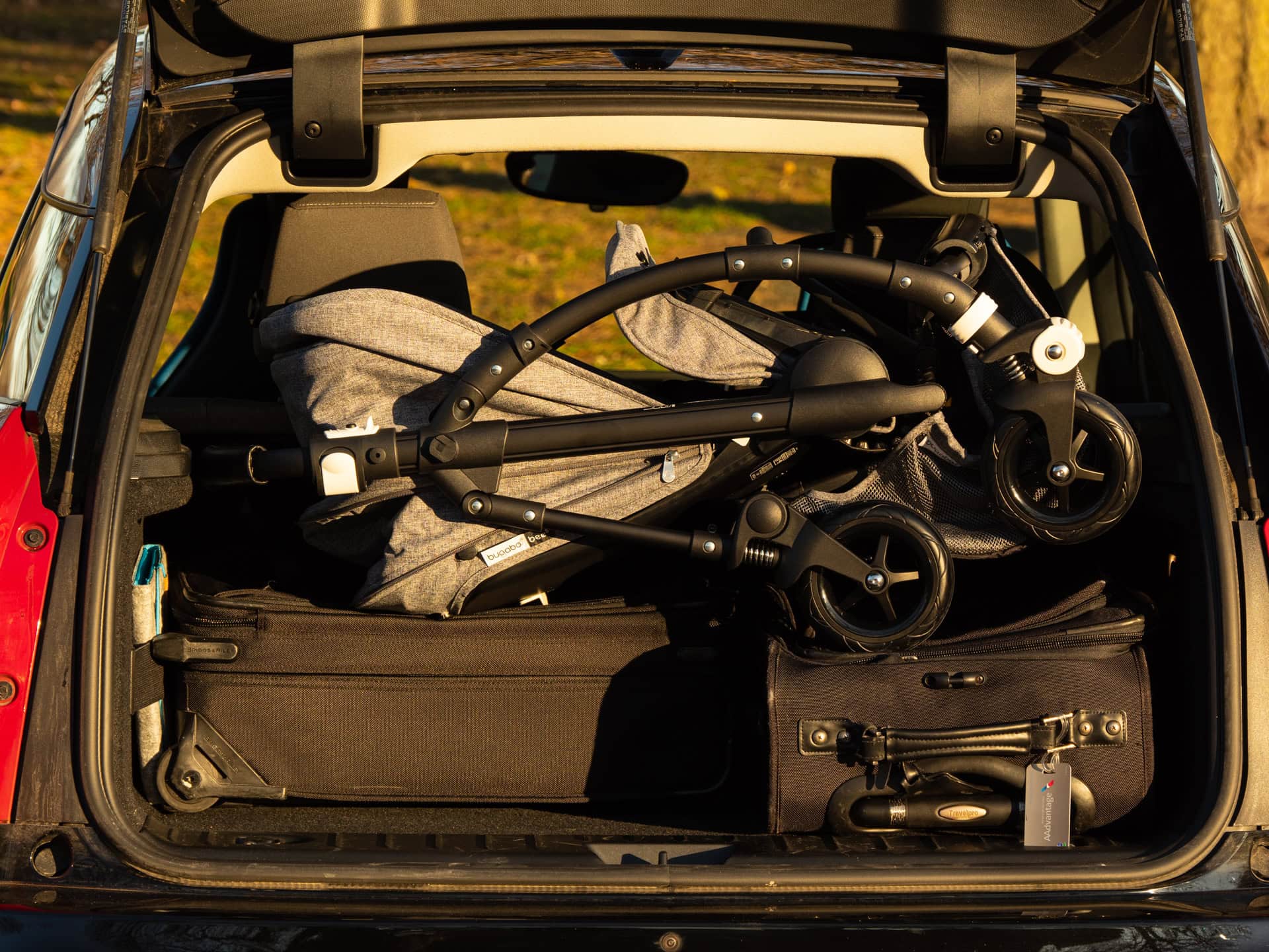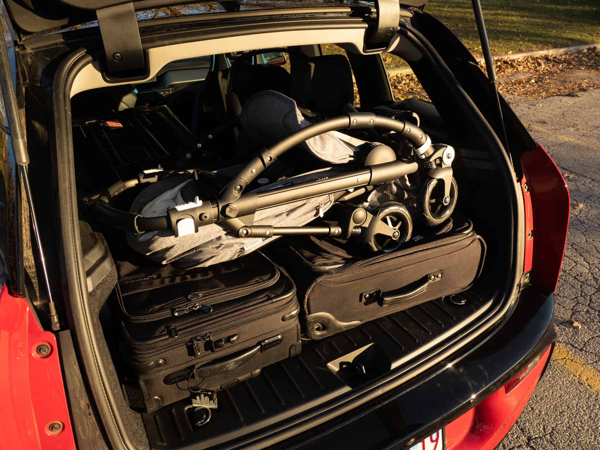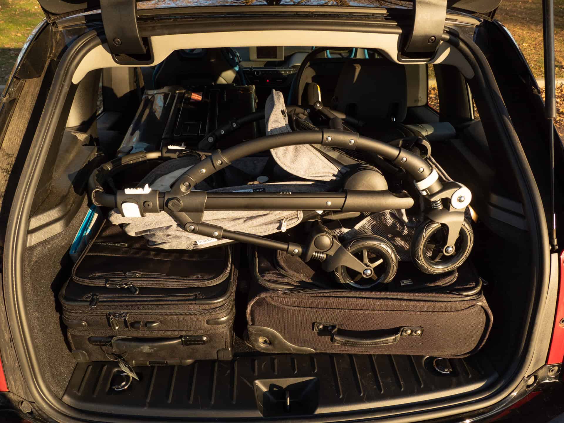 My experiment now brings forward a couple of airline-sized carry-on bags. They’re not on the smaller side, as a matter of fact, they’re beyond what’s acceptable for a European airline. Furthermore, I included a hardshell large bag – the type you have to check-in before flying. With the left seat folded down and the car seat on the right side, I squeezed in all three bags, along with the Bugaboo Bee5 stroller. As you can see in the images below, there was still some room to spare.