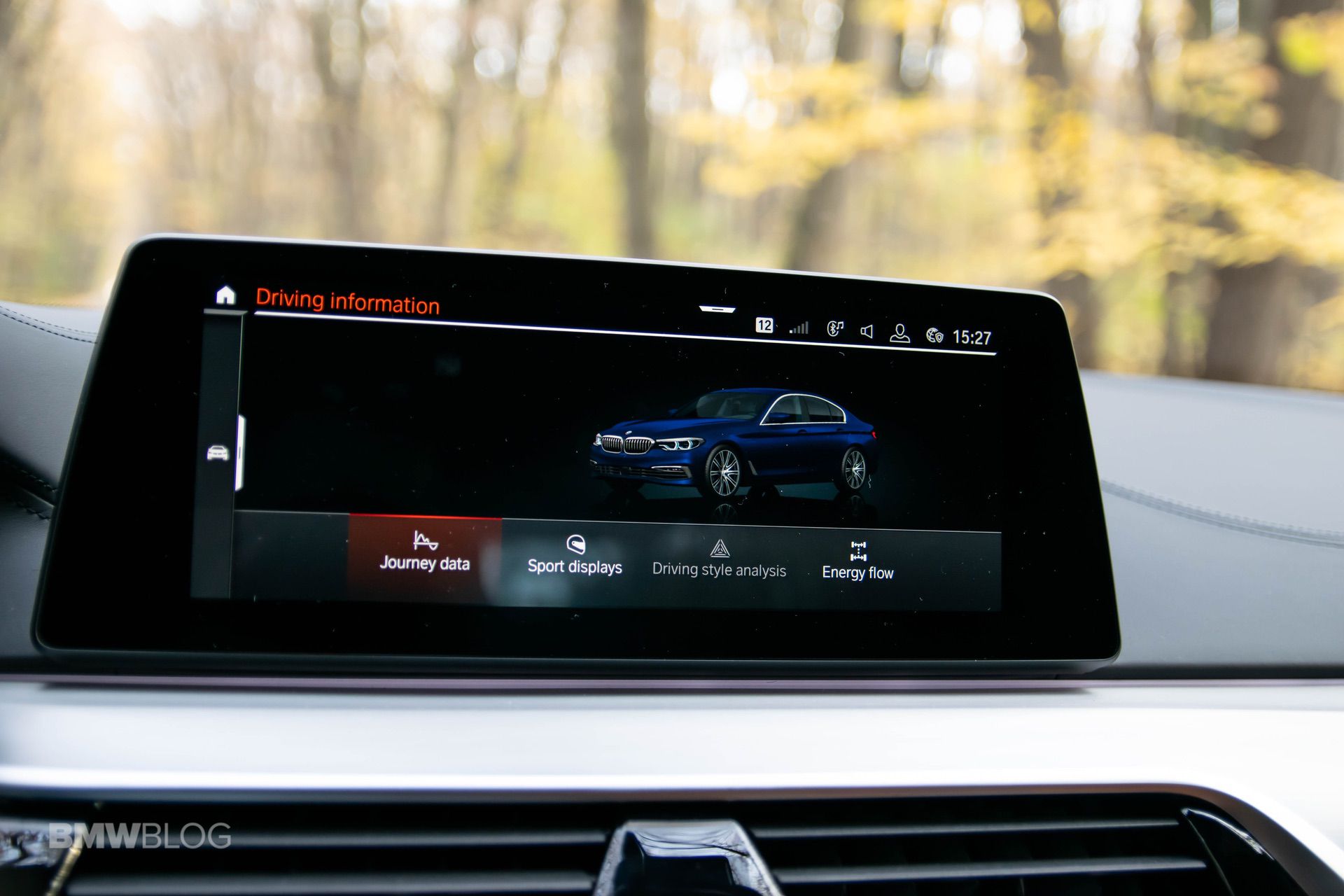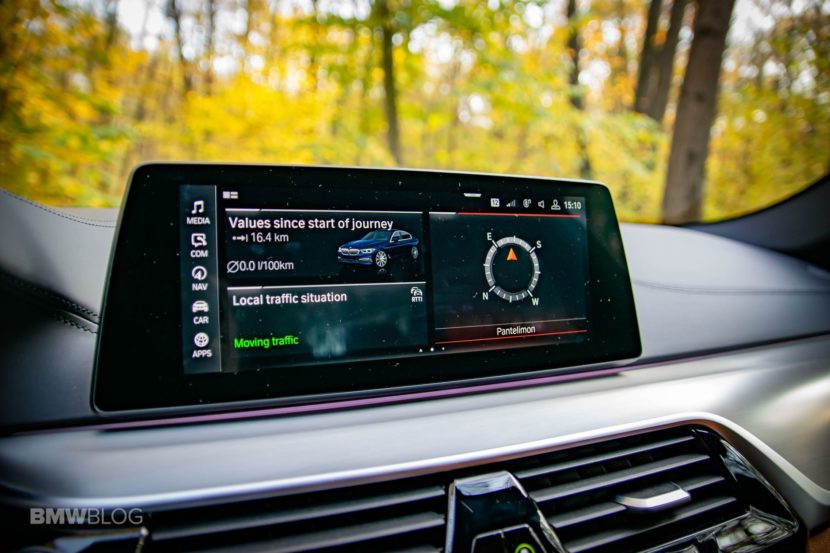 They are also the ones that provide all the information you need when driving this car. The BMW 530e starts off in Auto eDrive mode which means the instrument cluster will be dominated by a blue theme with the speedometer on the left and a different kind of tach on the right. Instead of the usual rev counter, you now have a meter that shows you how efficient you’re driving and how much power you’re drawing from the batteries. It’s all meant to help you get the most range out of the car.