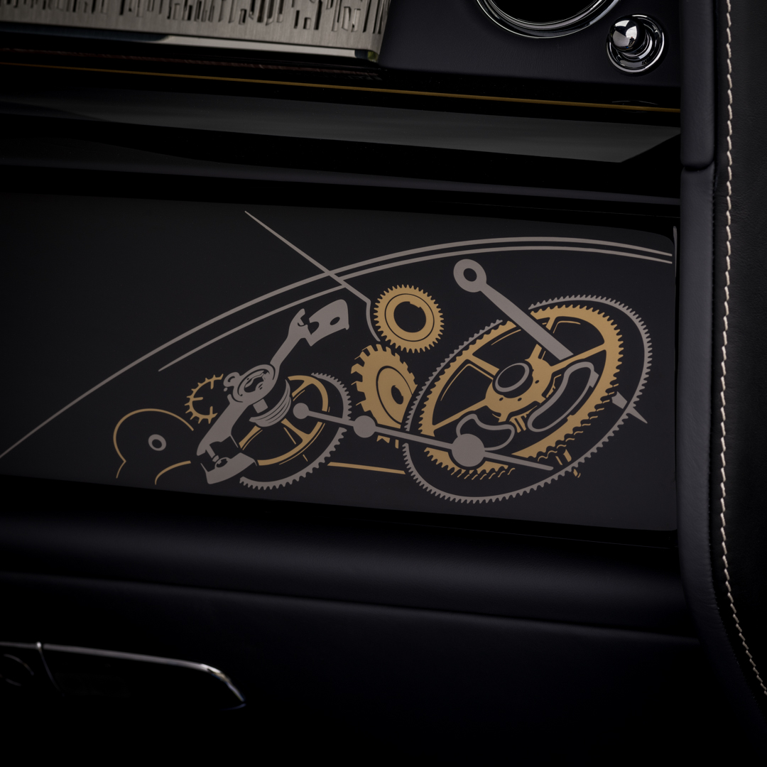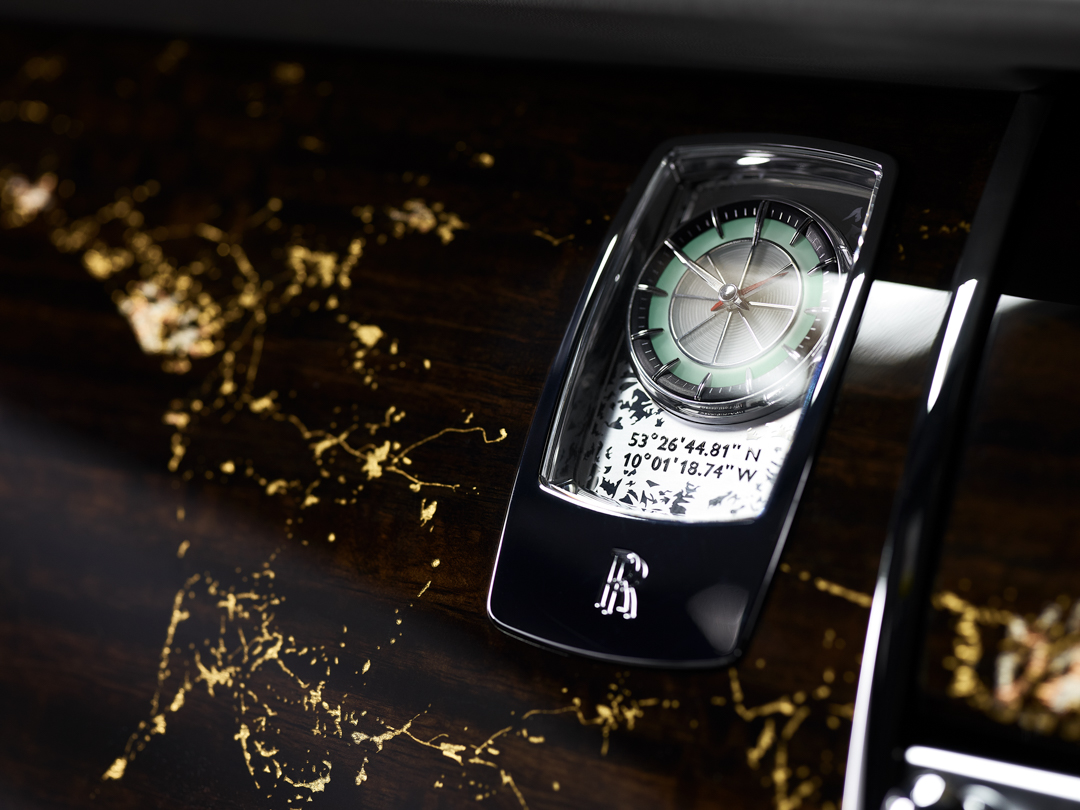 Anyone that owns a Rolls likely also has a fine collection of watches. Or a extremely gaudy one but let’s assume the former. The “Horology” (study of time-keeping and art of watch-crafting) Phantom was designed after a meeting of a Rolls designer and master watchmakers in La Chaux-de-Fonds in Switzerland, the watch-making capital of the world. It features a lot of gold inside, as well as a depiction of a watch movement in the glass art gallery. The Rolls clock is also in a solid silver guilloché case.