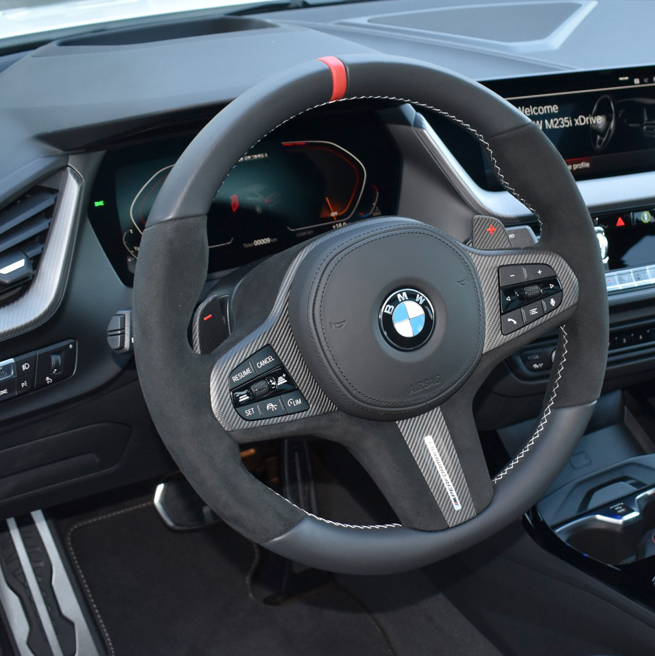 Inside, we see the M Performance steering wheel with Alcantara cover, a red 12 o’clock marking and carbon trim. Another eye-catcher are the carbon shift paddles, which indicate their function with plus and minus symbols in red.