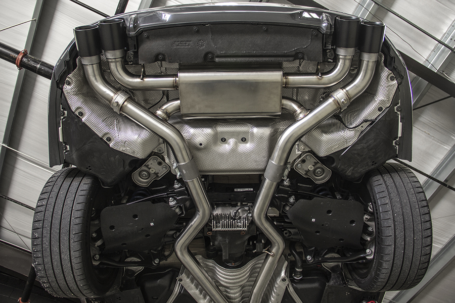 The entire system is made of stainless steel and the piping is larger as well, not just the tips, measuring 76 mm vs the stock 70. That means the car can breathe easier and leads to power and torque gains.
