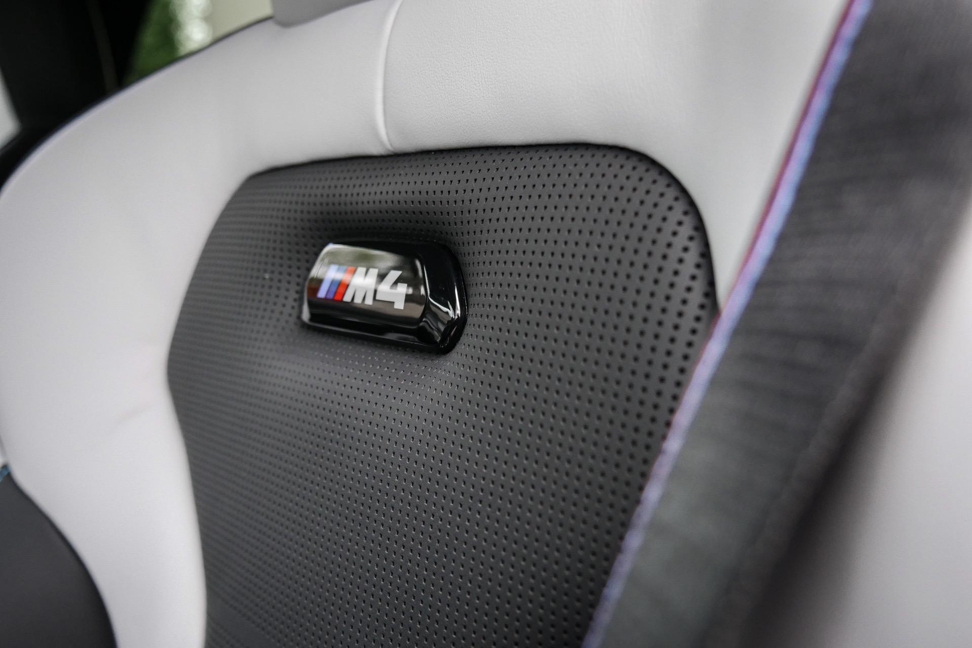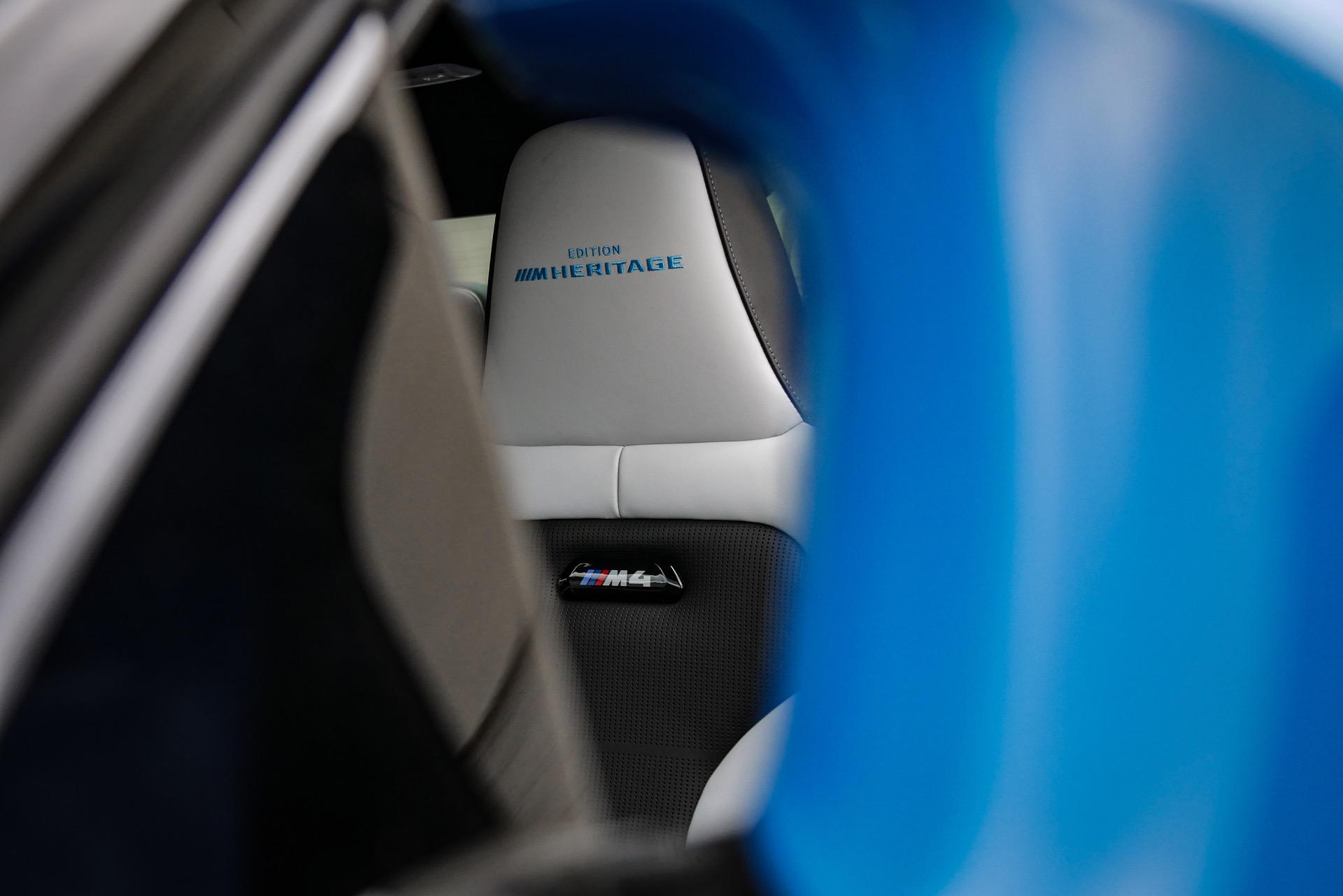 Inside, the special BMW M4 Edition M Heritage features full leather M seats in a bicolor design. Each seat color is oriented towards the exterior paint and is complemented by partly bicolored contrast stitching.