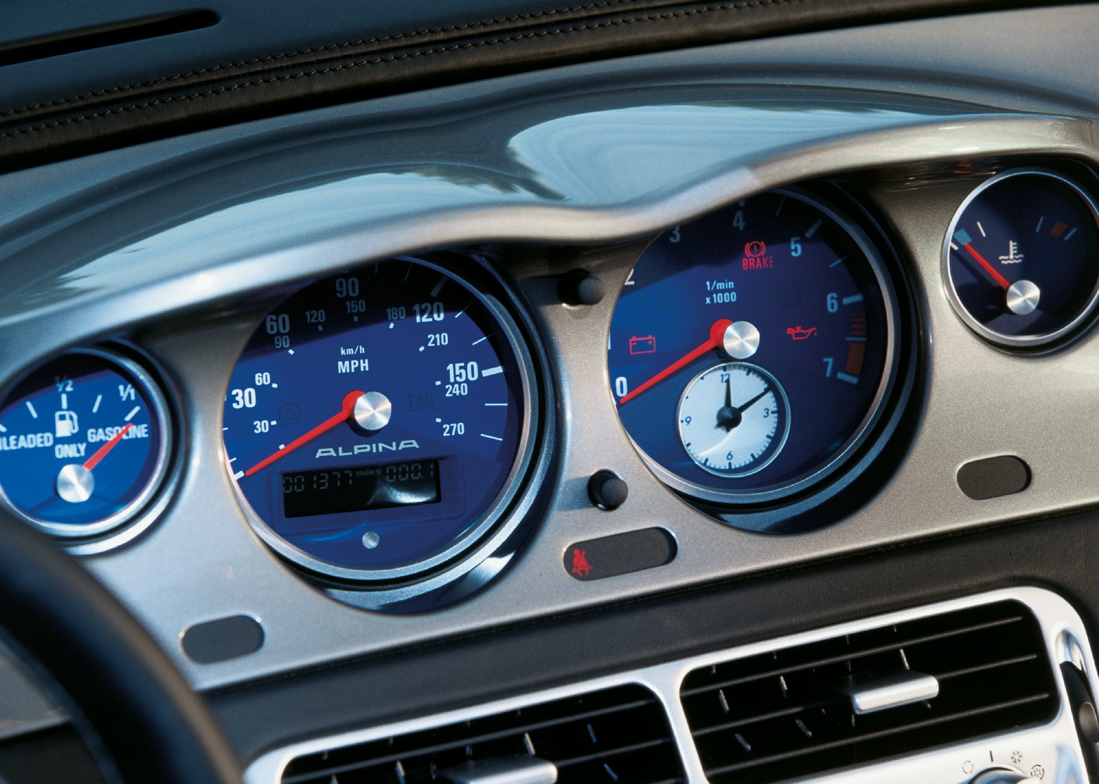 ALPINA also replaced the original Z8 steering wheel with a special one that also accommodated the gear shift paddles, which were in fact two bulges with “+” and “-” signs at 10:10 position on the wheel. As part of the bespoke treatment, the Buchloe-based tuner also equipped the ALPINA V8 Roadster with a special, high-grade, more refined interior leather upholstery and with a special ALPINA-branded analogue instrument cluster with ALPINA Blue background.