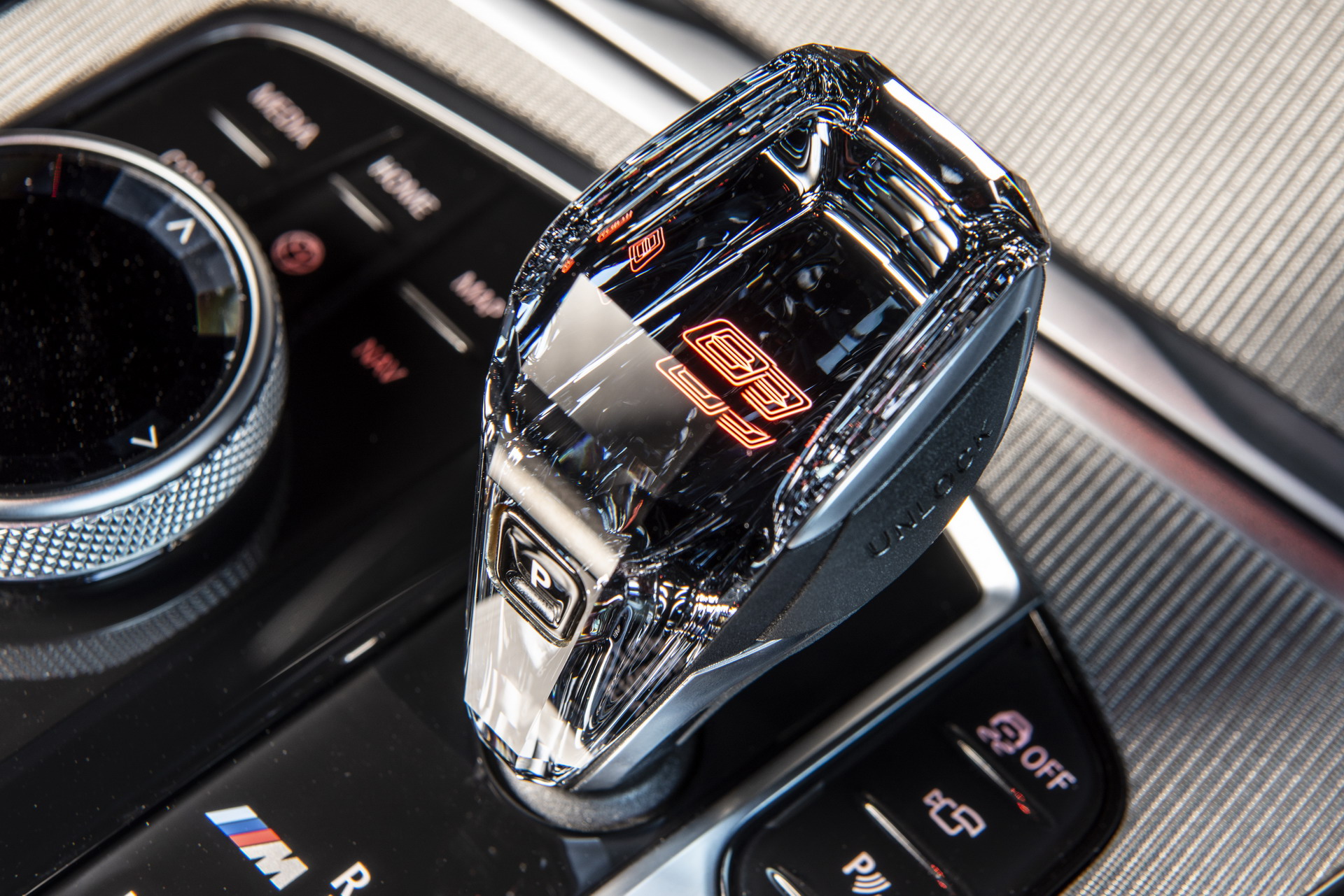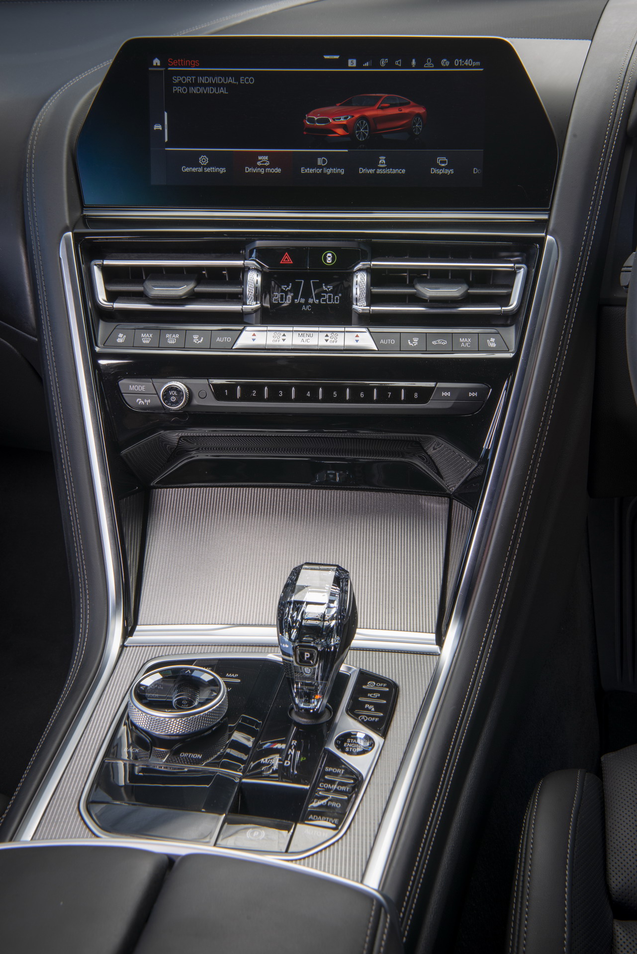 The cabin of this V8-powered 8 Series is dressed in the full BMW Individual Merino Black leather upholstery, with aluminum trim finishers on the center console, CraftedClarity glass applications and ///M seat belts.