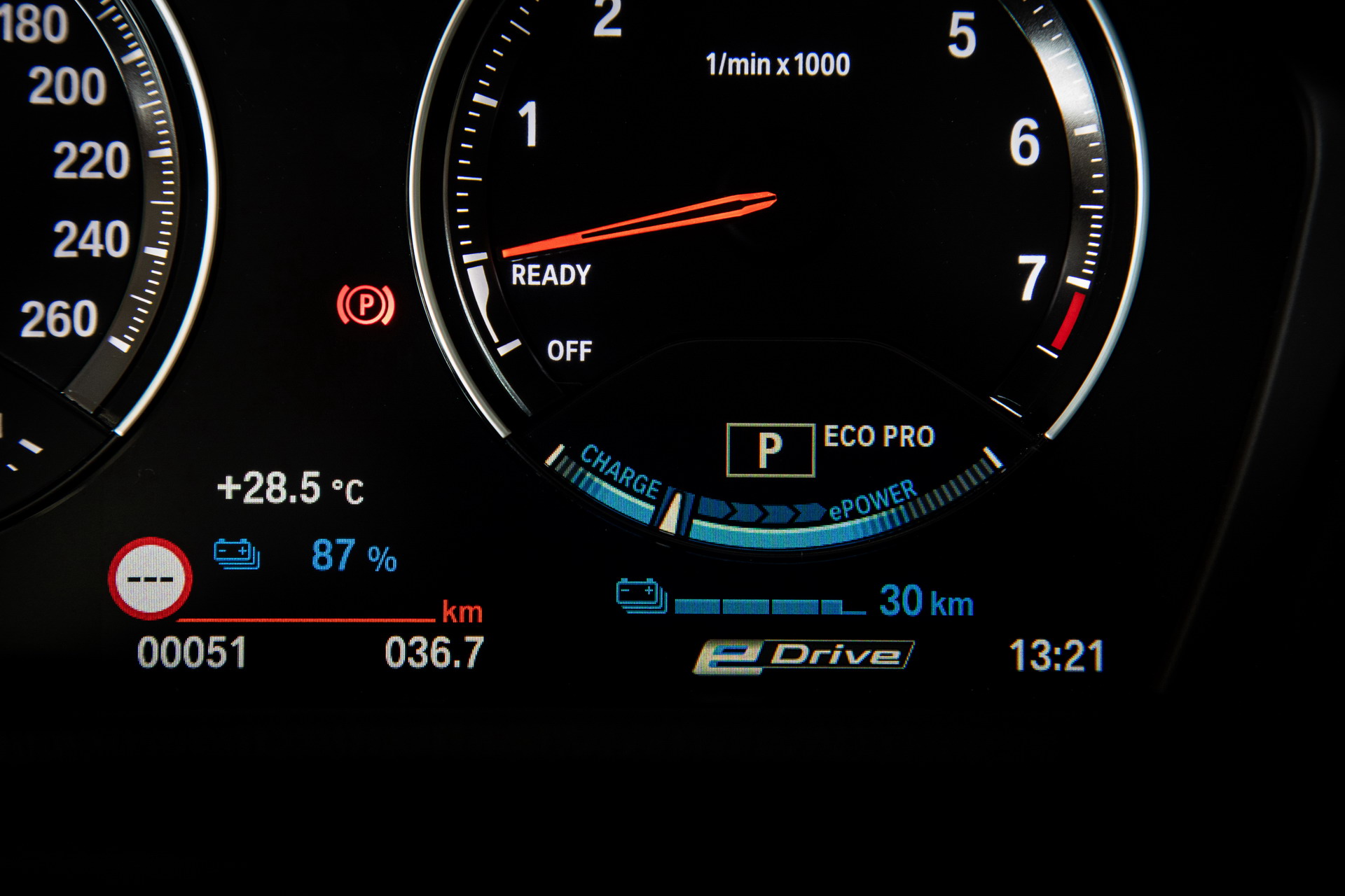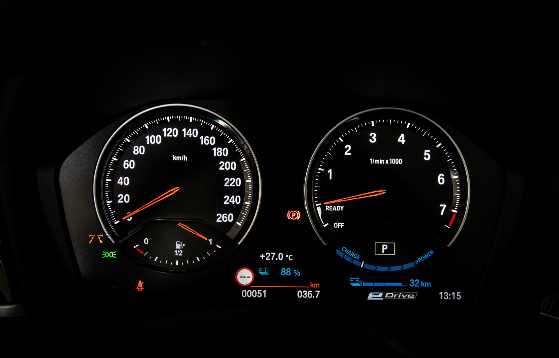 When it comes to distinctive design features, the electrified X1 can be easily recognized by the separate flap on the left front wing, which hides the charging port for the electric battery. The engine cover displays the eDrive inscription on a blue stripe, whereas inside you also get an eDrive logo in the instrument cluster.