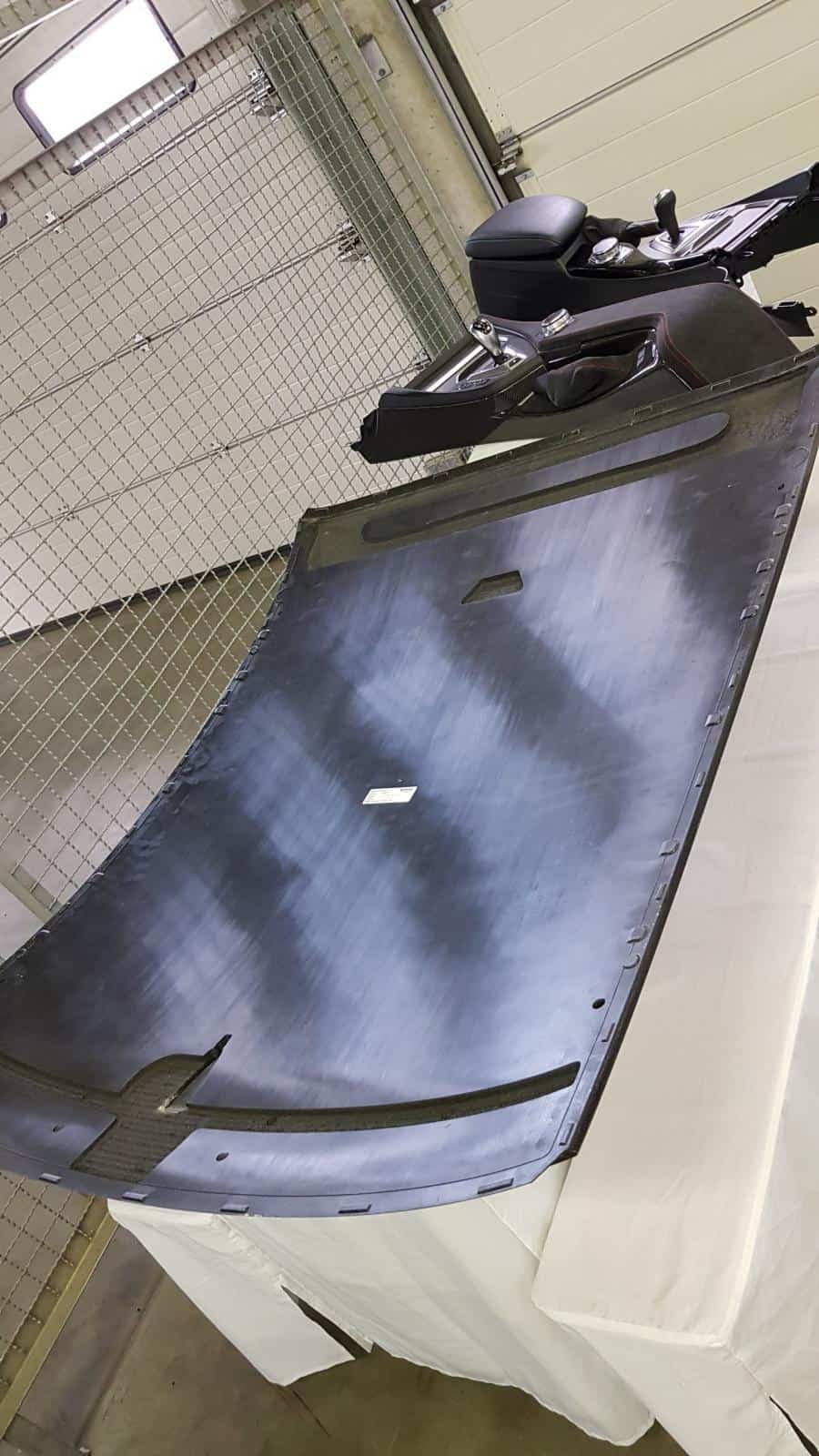 The cross member bar that connects both middle sections of the side arches of the roof is absent on the CS. The roof is fitted from the inside and the rails for the accessory roof rack have been removed. The roof is made of two layers of carbon fiber (featuring a 2 cm weave pattern) pressed together with in the middle a honeycomb structure.