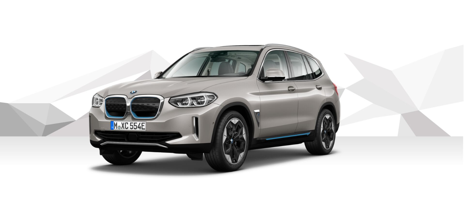 iX3 Impressive in Cashmere Silver metallic, with standard BMW i blue accents