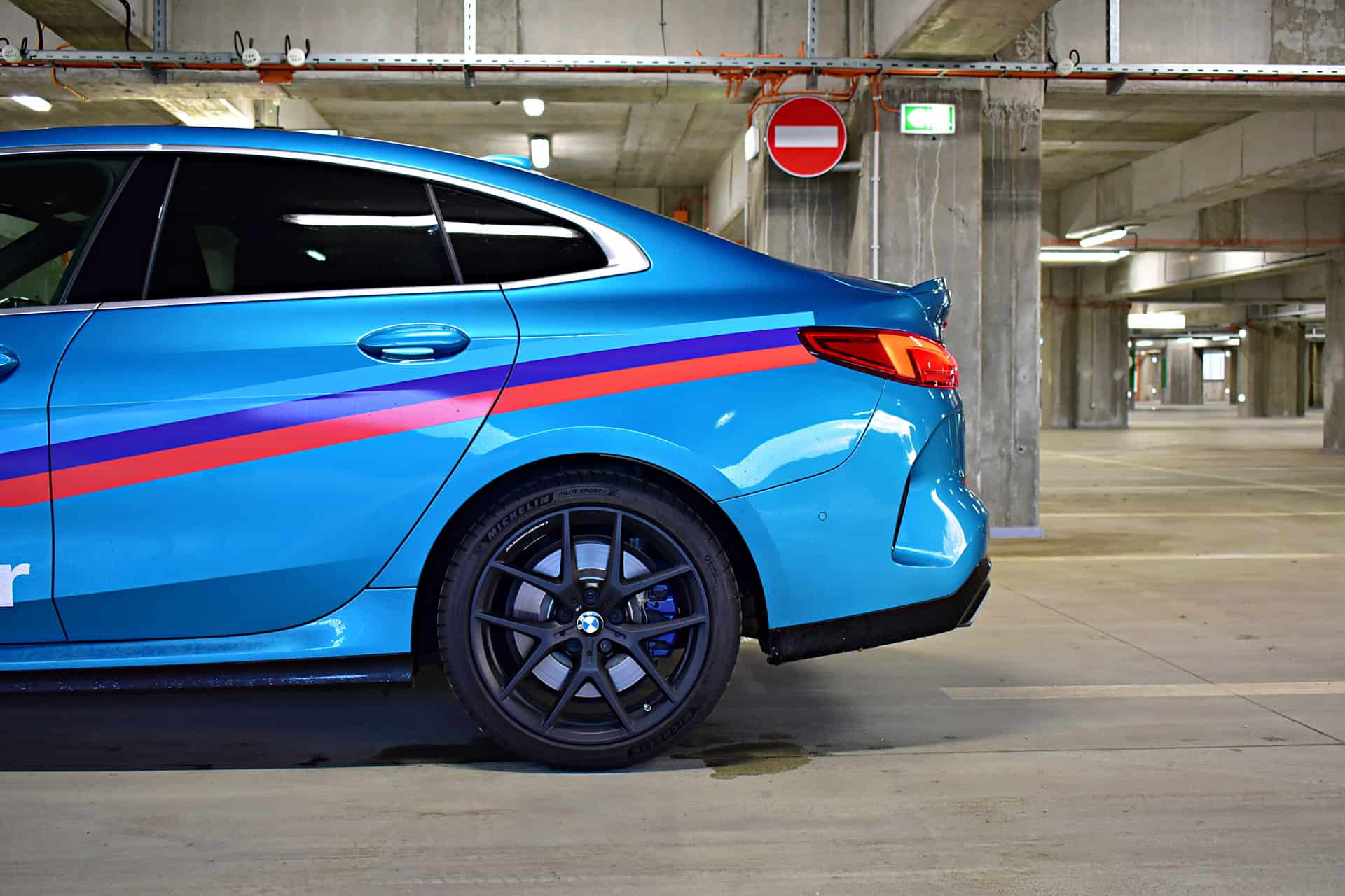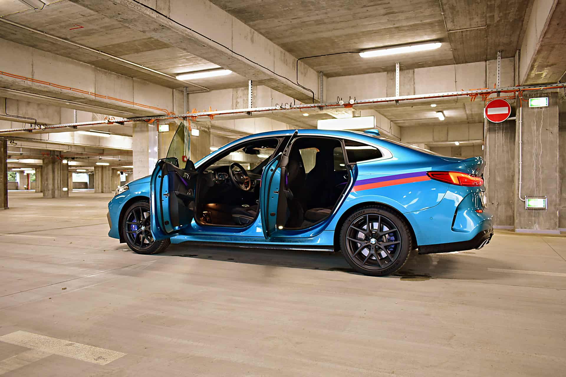 The burnished black 19″ alloys, equipped with race tires, further made a striking contrast with the Snapper Rocks Blue paint finish. But it all came with a compromise: such rubber provides less comfort than conventional ones.