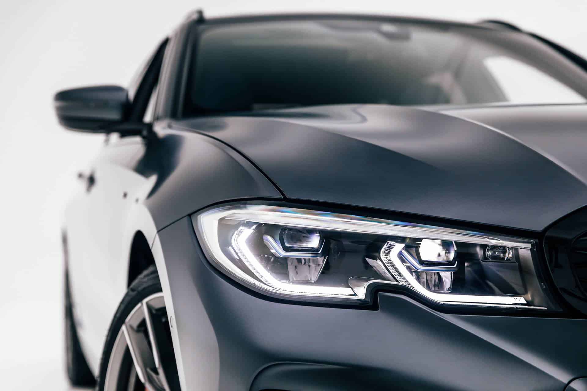The Frozen Dark Grey paint not only comes into its own in the photo studio, but it also creates exciting images as a dark contrast to red lighting. Incidentally, we also get a good visual impression of the optional laser headlights and the standard LED rear lights of the BMW 3 Series Touring.